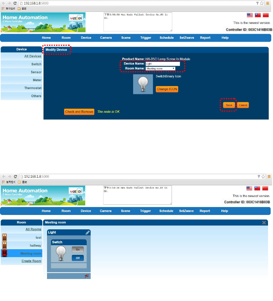 Step 3: Edit the content of light device. Please input the device name and room name.