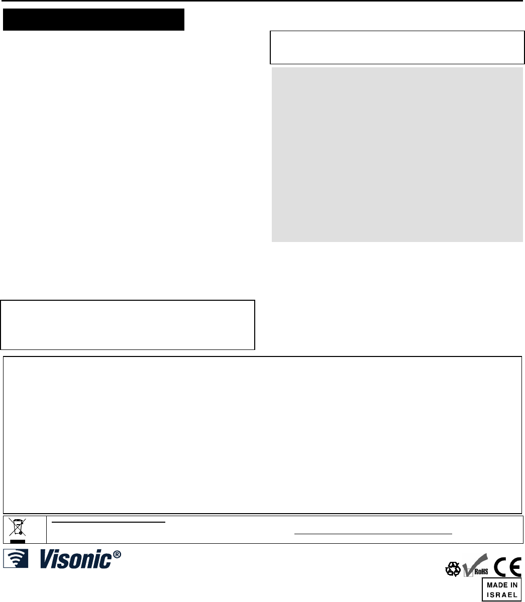 VISONIC LTD (ISRAEL): P.O.B 22020 TEL-AVIV 61220 ISRAEL. PHONE: (972-3) 645-6789, FAX: (972-3) 645-6788