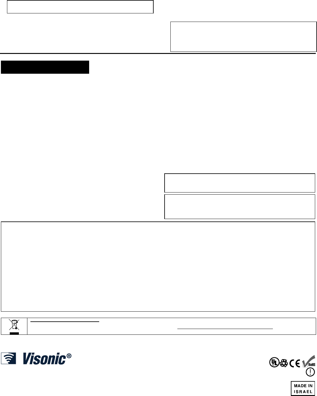 VISONIC LTD. (ISRAEL): P.O.B 22020 TEL-AVIV 61220 ISRAEL. PHONE: (972-3) 645-6789, FAX: (972-3) 645-6788