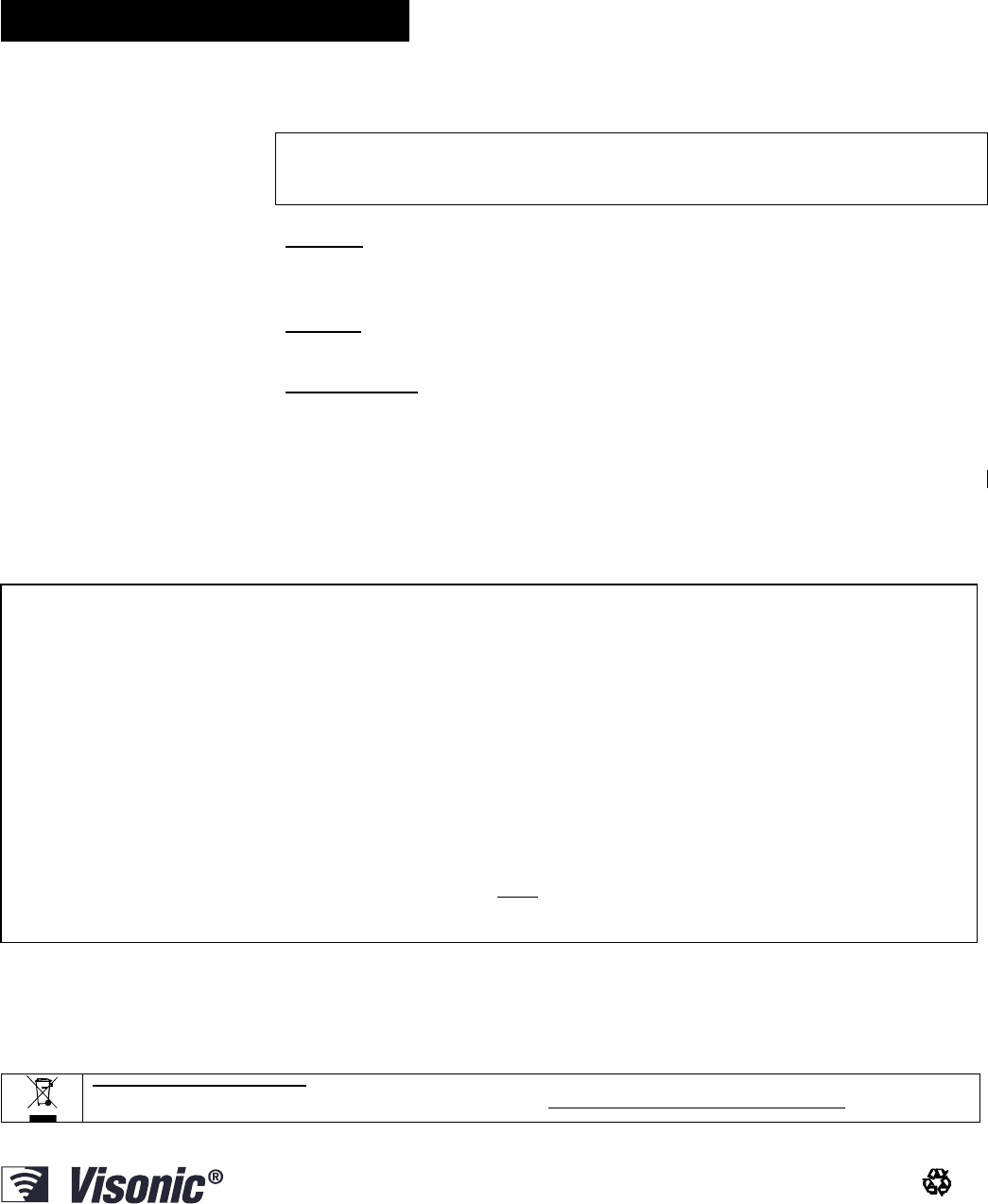 VISONIC INC. (U.S.A.): 65 WEST DUDLEY TOWN ROAD, BLOOMFIELD CT. 06002-1376. PHONE: (860) 243-0833, (800) 223-0020. FAX: (860) 242-8094
