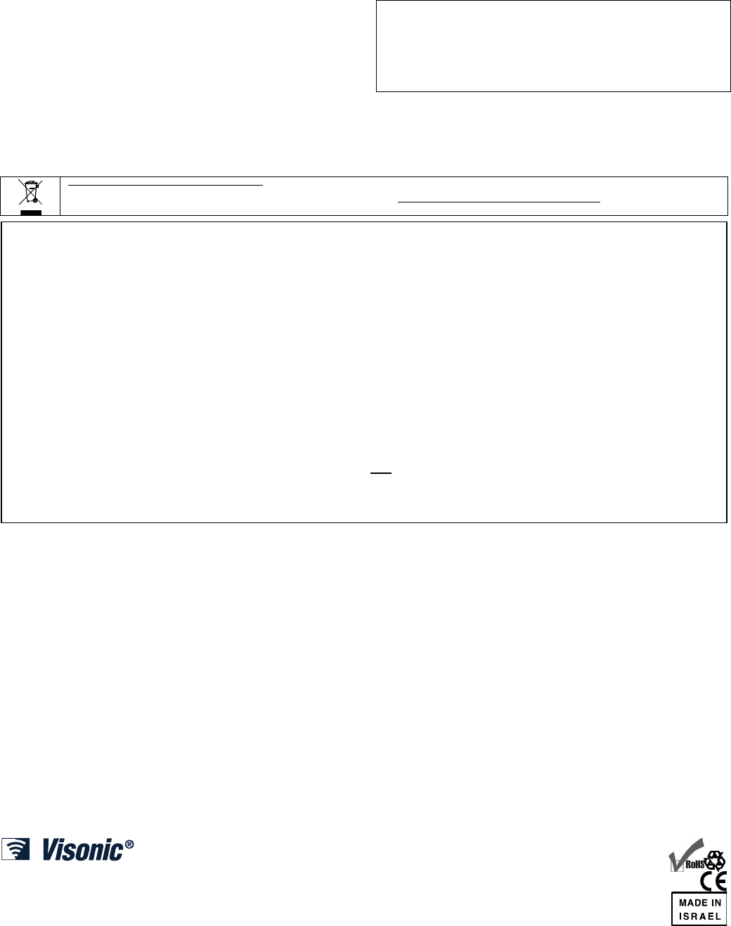 VISONIC LTD. (ISRAEL): P.O.B 22020 TEL-AVIV 61220 ISRAEL. PHONE: (972-3) 645-6789, FAX: (972-3) 645-6788