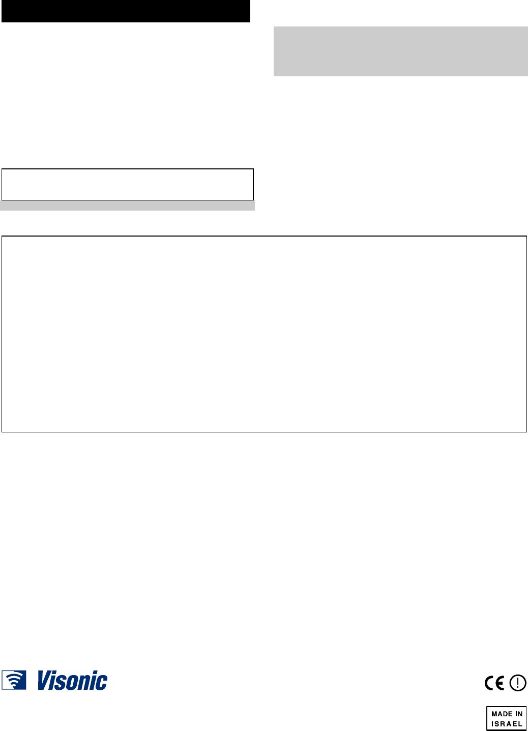 VISONIC LTD (ISRAEL): P.O.B 22020 TEL-AVIV 61220 ISRAEL. PHONE: (972-3) 645-6789, FAX: (972-3) 645-6788