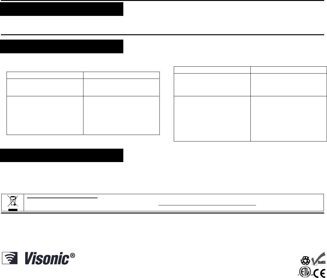 VISONIC INC. (U.S.A.): 65 WEST DUDLEY TOWN ROAD, BLOOMFIELD CT. 06002-1376. PHONE: (860) 243-0833, (800) 223-0020. FAX: (860) 242-8094