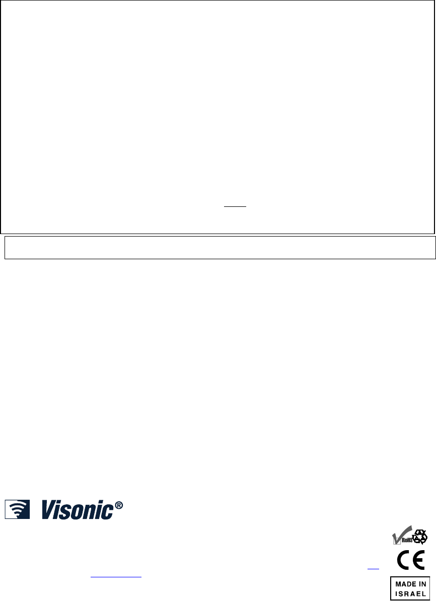 VISONIC LTD. (ISRAEL): P.O.B 22020 TEL-AVIV 61220 ISRAEL. PHONE: (972-3) 645-6789, FAX: (972-3) 645-6788