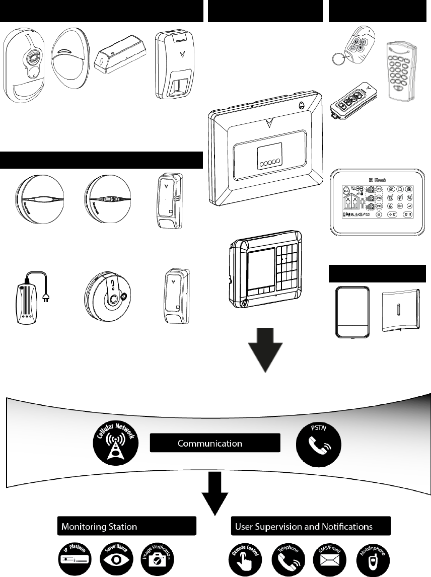 The system consists of the PowerMaster-33 G2 control panel that does not include a built-in keypad and that operates