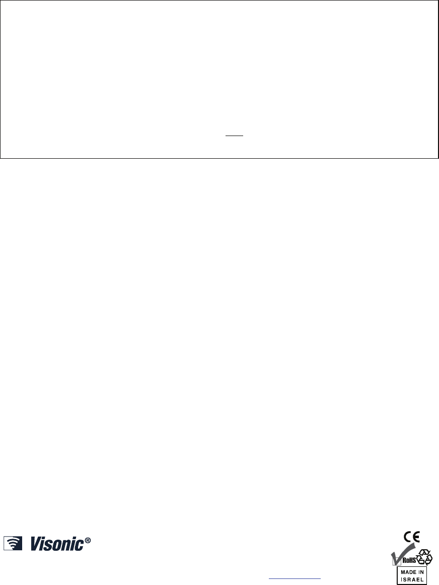 VISONIC LTD. (ISRAEL): P.O.B 22020 TEL-AVIV 61220 ISRAEL. PHONE: (972-3) 645-6789, FAX: (972-3) 645-6788