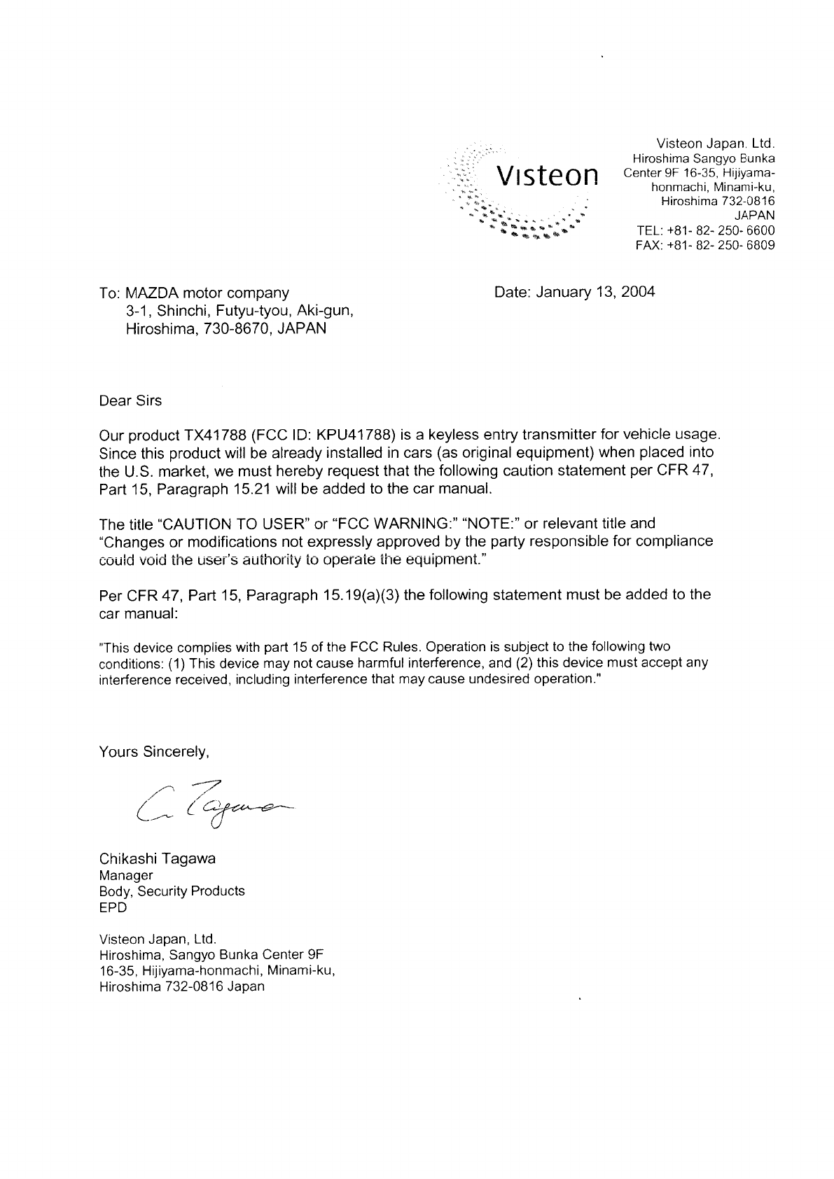 Visteon Japan 41788 Keyless Entry System User Manual manual