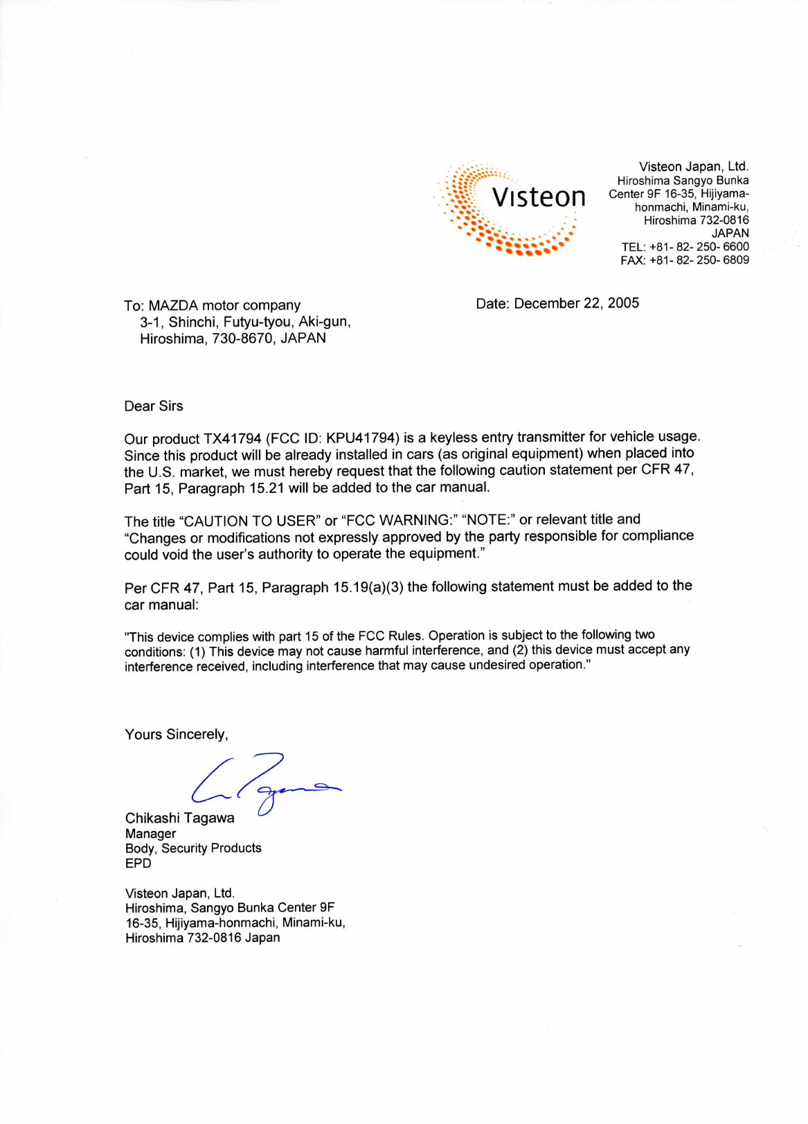 Visteon Japan 41794 Transmitter of a keyless entry system for autos User Manual manual