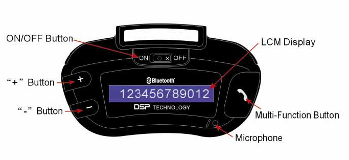 Your Bluetooth Car Kit is equipped with the following buttons and functions as shown in the