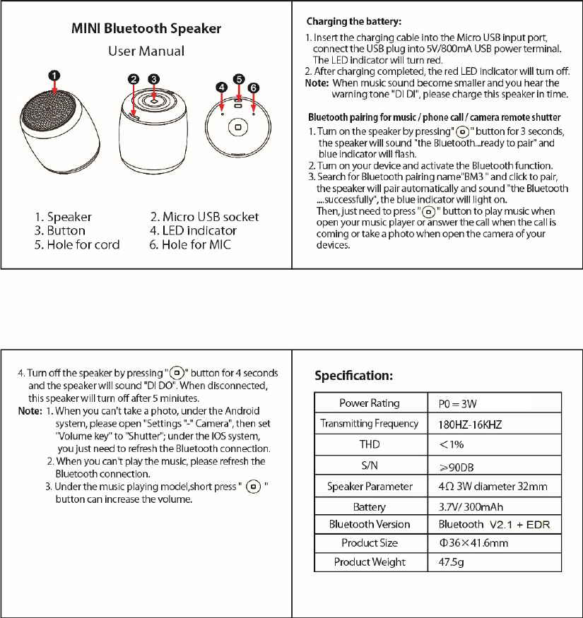Vitebo Science Technology Develop VTB-BM3 Mini Bluetooth speaker with self-timer User Manual
