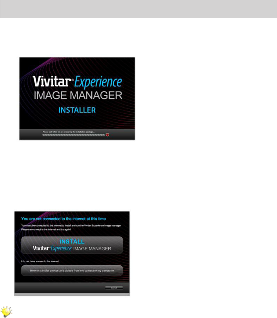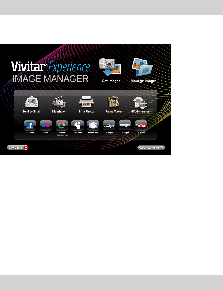 • Install the bundled software application on the CD, Vivitar Experience Image Manager, for