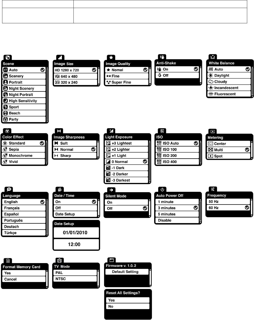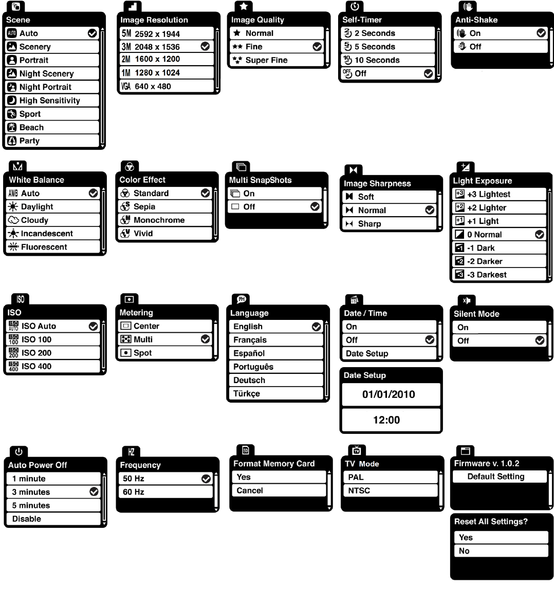 Auto / Scenery / Portrait / Night Scenery / Night Portrait /