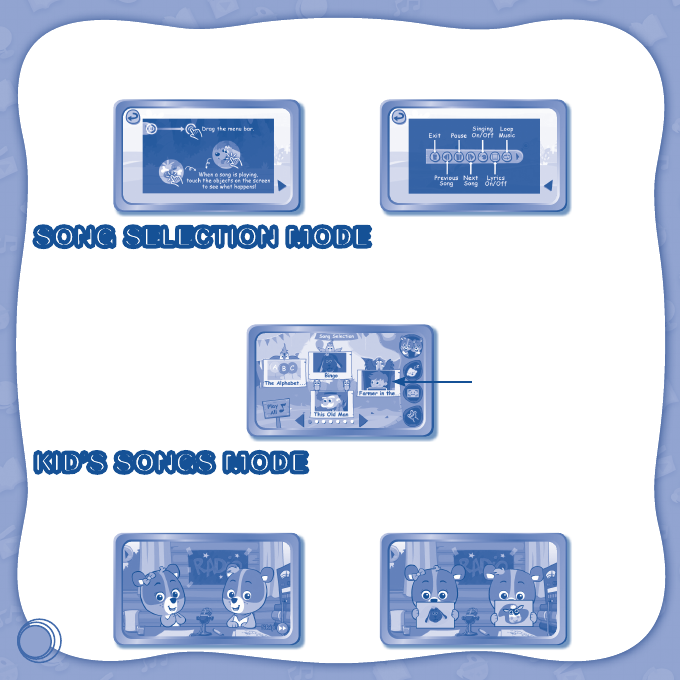 There are ve categories of baby play: Song Selection, Kid’s Songs, Lullaby Songs, Avatar, and Baby Signs.