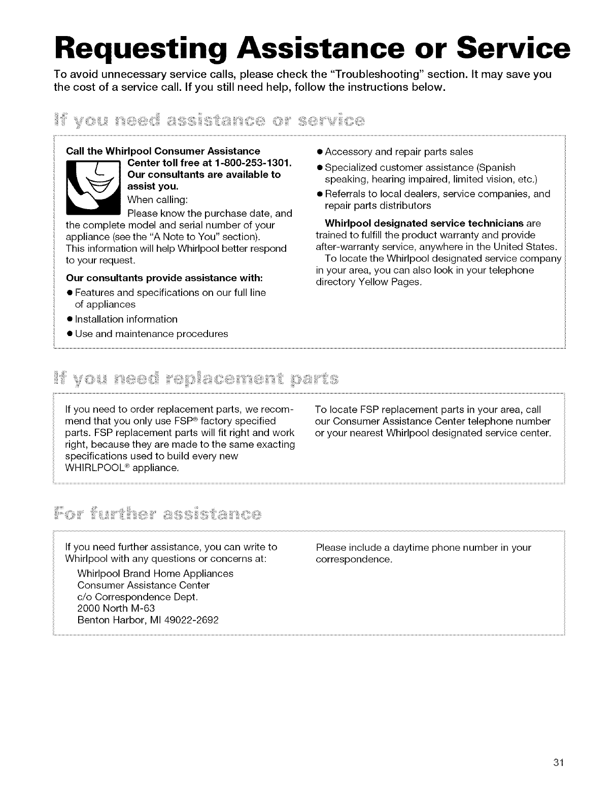 additional help can be found by checking the "Requesting Assistance or Service" section or by calling the