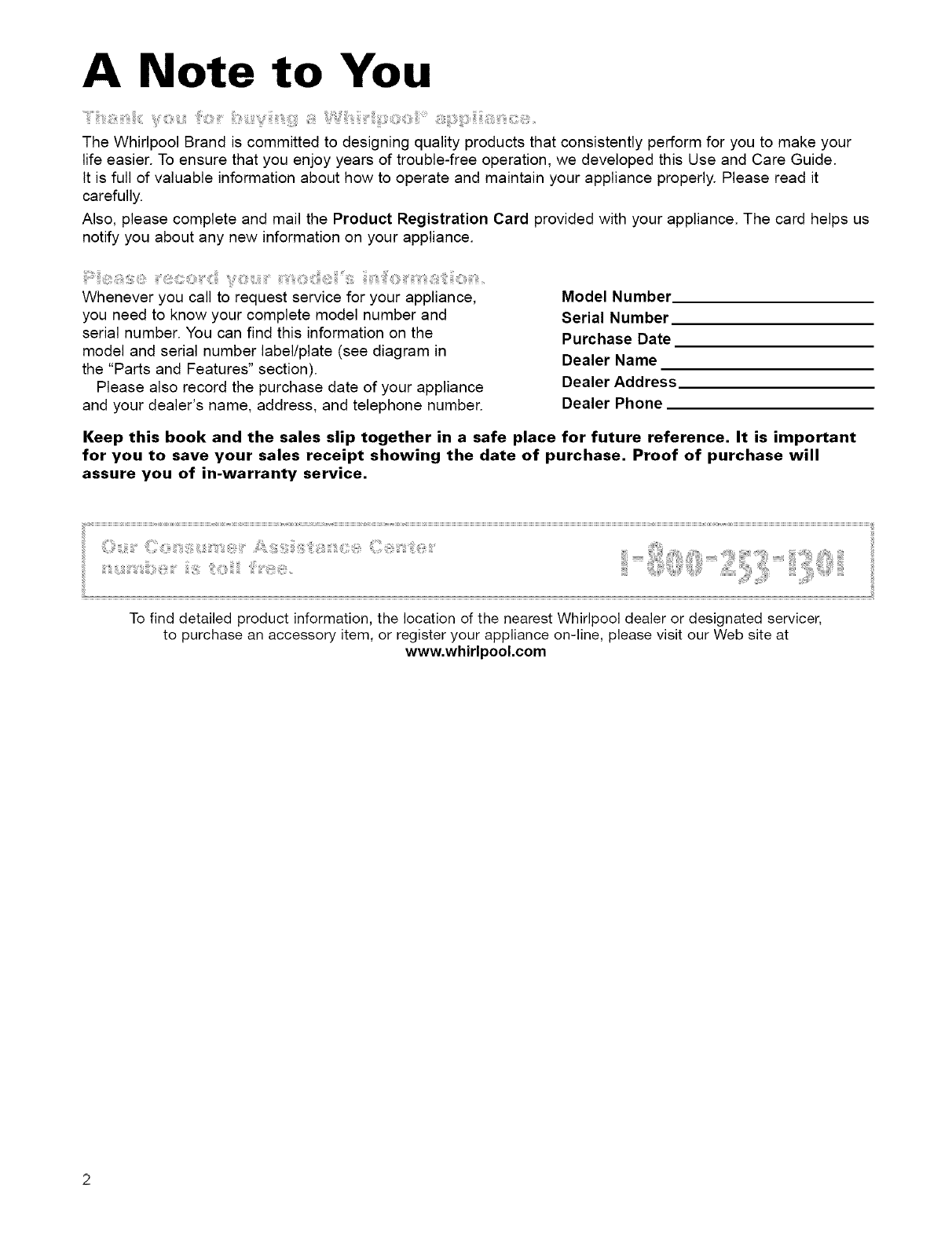 To find detailed product information, the location of the nearest Whirlpool dealer or designated servicer,