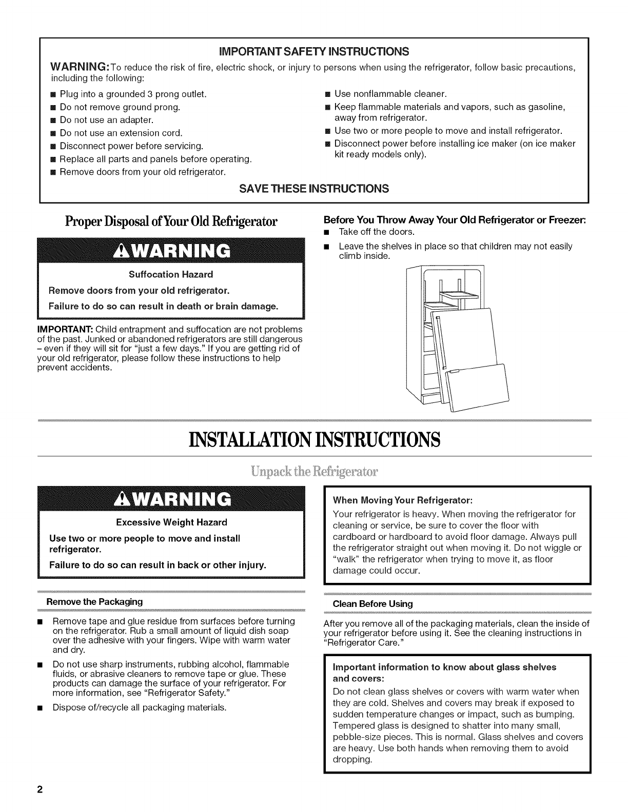 [] Use two or more people to move and install refrigerator.