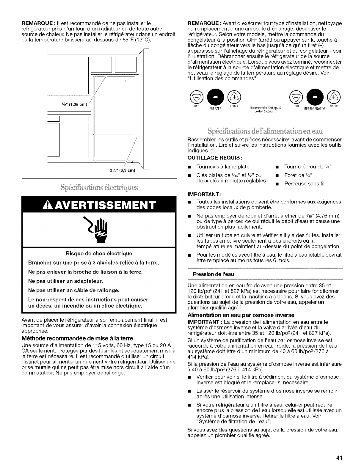 Temperature de I'eau 33° - 100°F (1° - 38°C)