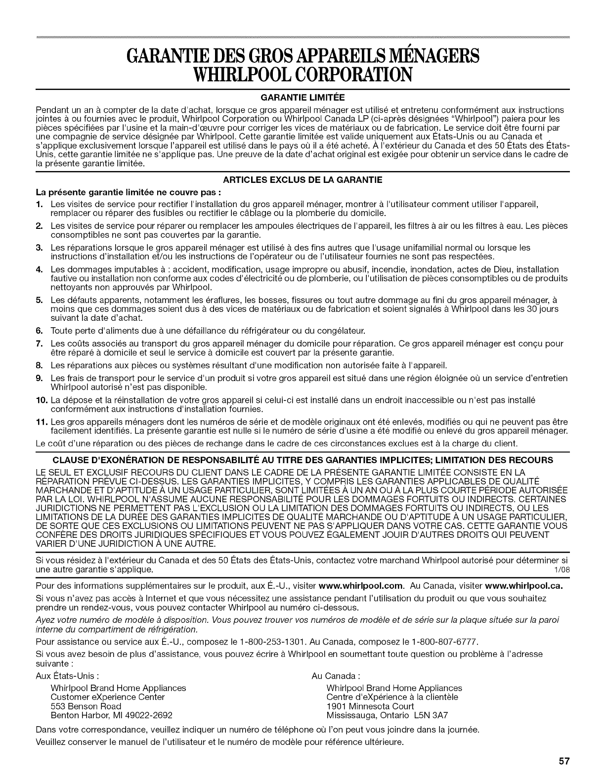 PAR LA LOI. WHIRLPOOL N'ASSUME AUCUNE RESPONSABILITI 2 POUR LES DOMMAGES FORTUITS OU INDIRECTS. CERTAINES