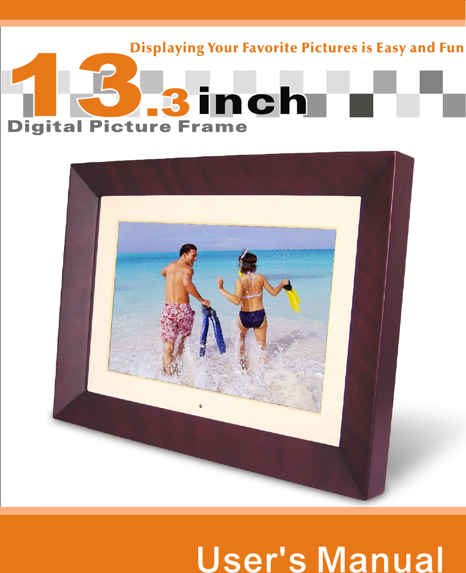 Product SpecificationProduct                     Resolution               Memory Card          Formats                                                        Image Formats         Audio Formats         Video Formats         USB Ports                Power Input              Power Output           Internal                     SpeakersCertification            13.3” Digital Photo Frame1280X800pixelSecure Digital™, Multi-Media Card™, Memory Stick™,Memory Stick Pro™, Memory Stick Duo™, Memory Stick ProDuo™, Compact Flash™, and USB flash drivesJPEG, BMP, PNG, GIF, TIFFMP3, WAV, WMA, AACMPEG1/2/4, M-JPEG, AVI, DivxUSB 2.0 (Host) x 1, mini-USB x 1AC 100V~240V, 50~60HzDC 12V/2A   CE / FCC / RoHS Features      Specification1.5WX2 Image rotation, zoom in, background music  Display files by name or by date ArcSoft™  effects: Dynamic Lighting, Face Beautify, and Face Tracking