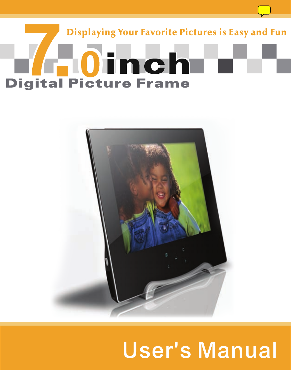 SpecificationHow to Use Your Digital Picture Frame Turning On and Off To turn the Digital Picture Frame on, just simply plug the AC adapter to a wall outlet and the Digital Picture Frame then switch the POWER switch to ON position or press the POWER button, and the system will shows the Function interface. * To turn off the Digital Picture Frame, just switch the POWER switch to OFF position or press and hold the POWER button until the screen is blackened. * * The power switch or the power button may vary from different models. Connecting to PC At any time connecting the Digital Picture Frame to the PC, it will enter USB mode. The screen will show the message “connecting to PC”. In USB mode, the Digital Picture Frame functions as a USB flash drive. To exit USB mode, simply unplug the USB cable or press ESC key. 6Product 7DN Libra Digital Photo Frame Resolution 800x600 pixel Memory Card FormatsSecure Digital™, Multi-Media Card™, Memory Stick™, Memory Stick Pro™, Memory Stick Duo™, Memory Stick Pro Duo™ and USB flash drives Image Formats  JPEG Audio Formats MP3   Video Formats Motion JPEG,XVID,H.264Sub-Display  Optional USB Ports  USB 2.0 (Host) x 1, mini-USB x 1 Power Input  AC 100V~240V, 50~60Hz   Power Output  DC 5V / 1.5A InternalSpeakers 0.5W x 2 Certification  CE / FCC / RoHS