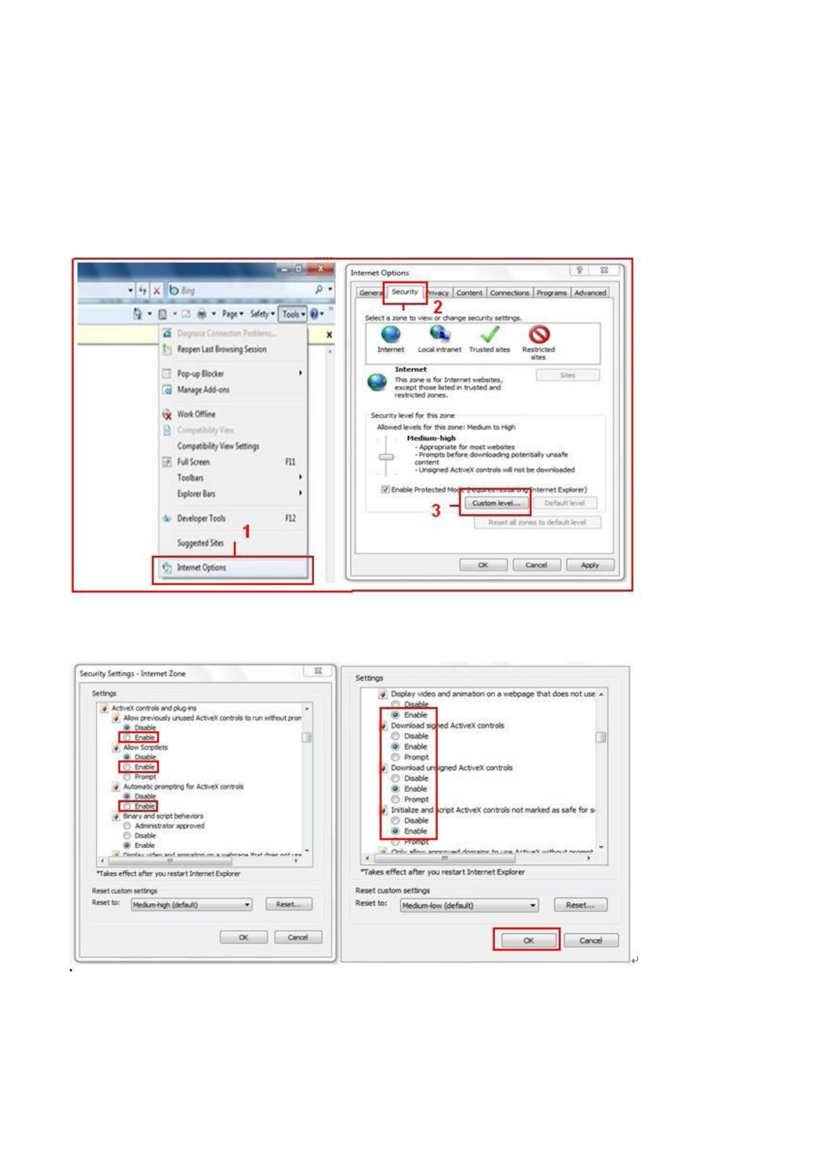 2. Change the ActiveX settings in “IE” browser > “Tool” > “Internet Options” > “Security” > “Custom Level” >