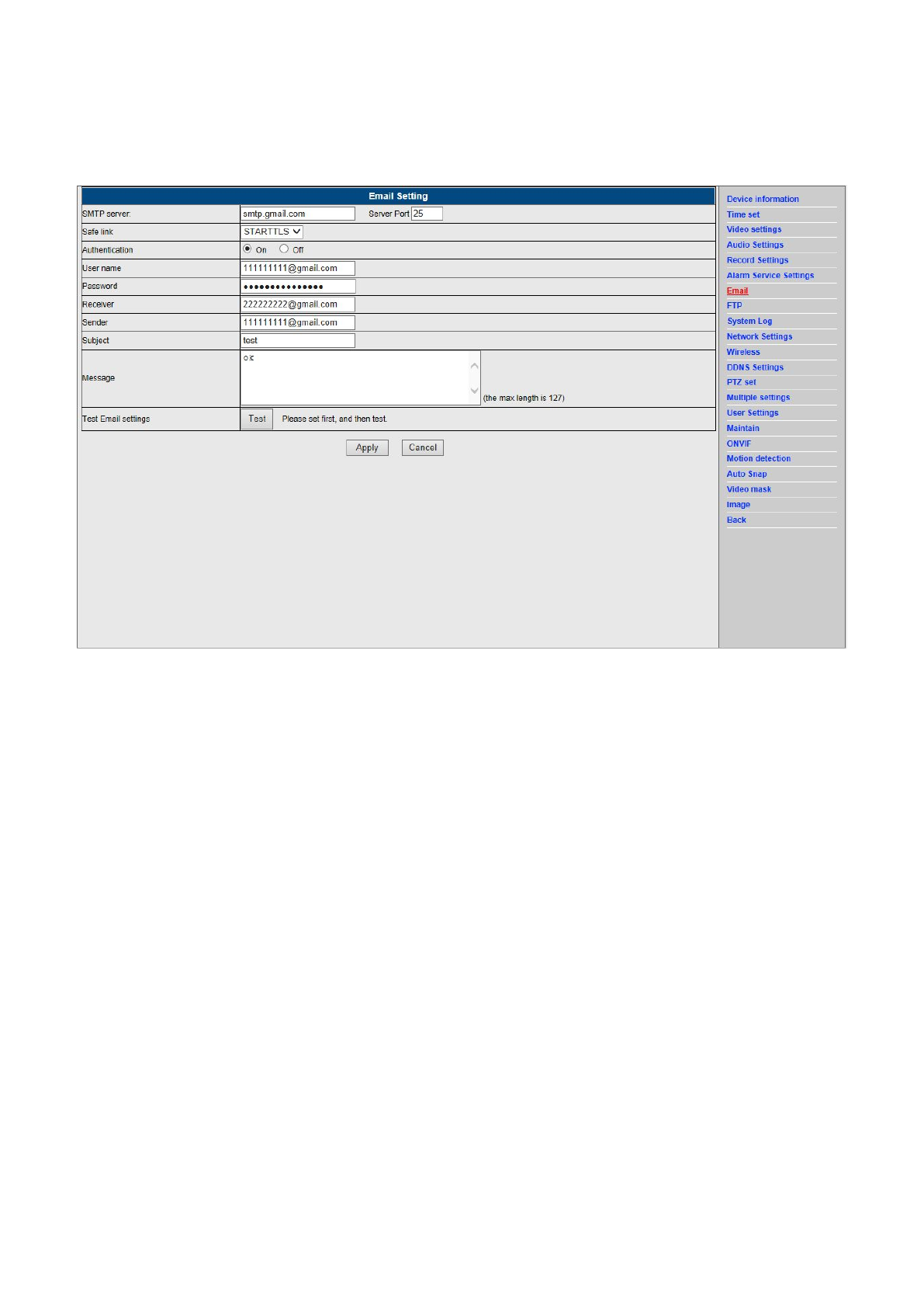 1) The email configuration screen serves for the preparation of the alarm function. If the motion detect