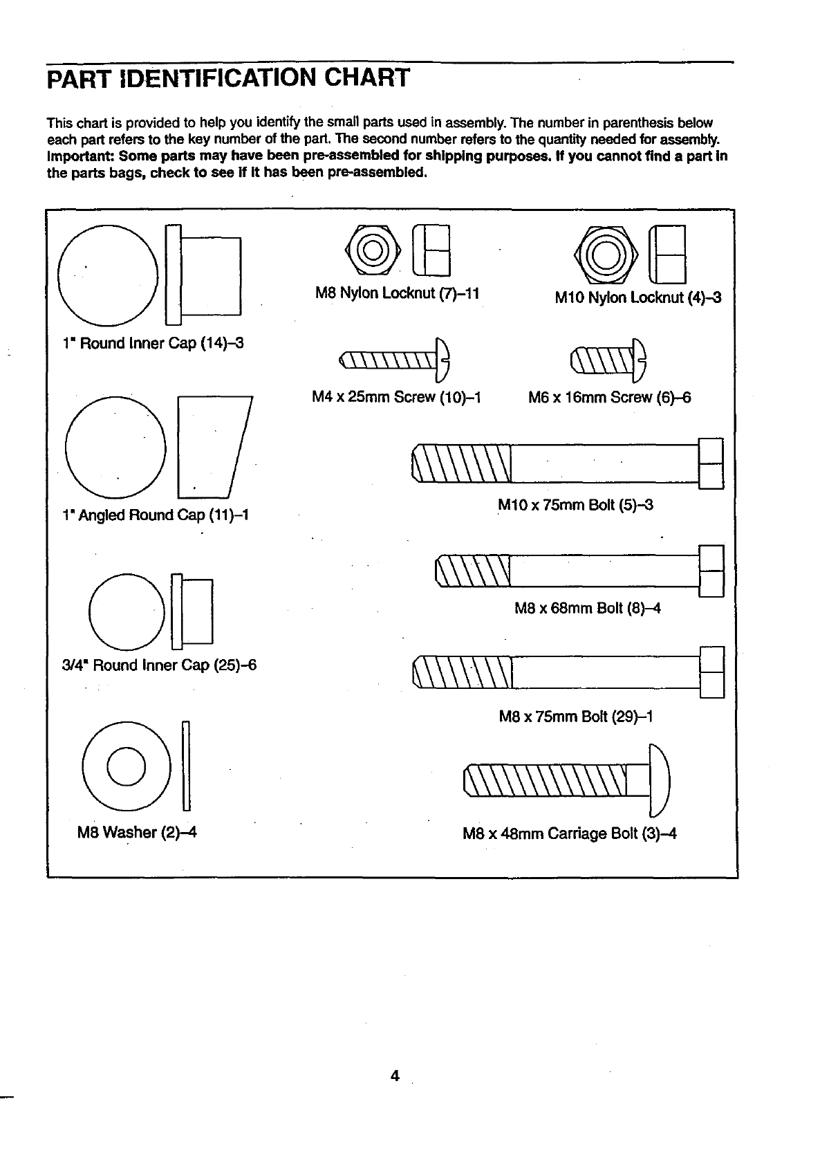 This chart is provided to help you identify the small parts used in assembly. The number in parenthesis below