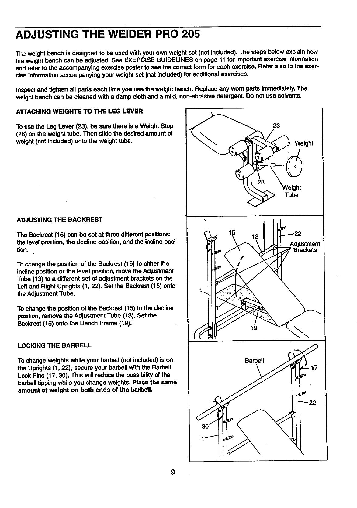 User Manual: Weider 831150360 831150360 WEIDER WEIDER PRO 205 BENCH - Manuals and Guides View the owners manual for your WEIDER WEIDER PRO 205 BENCH #831150360. Home:Fitness Equipment Parts:Weider Parts:Weider WEIDER PRO 205 BENCH Manual