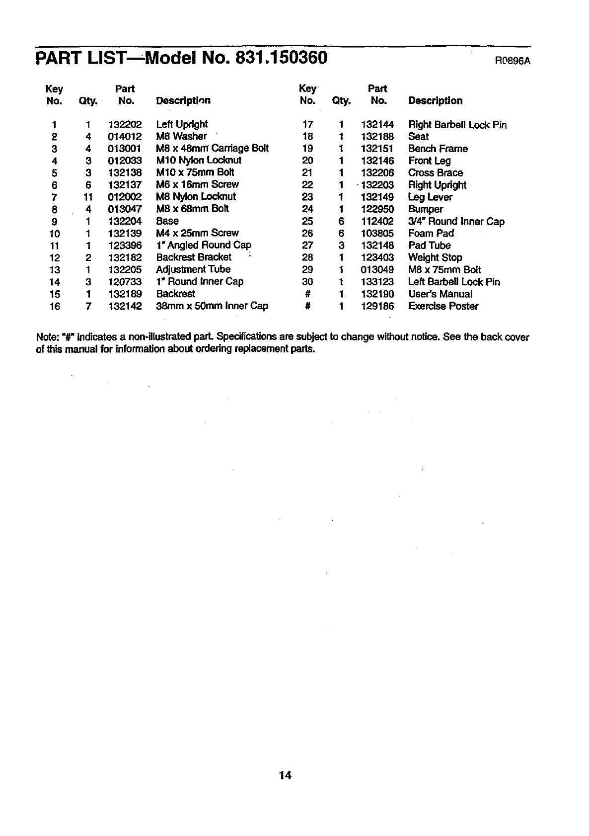 1 1 132202 Left Upright 17 1 132144 Right Barbell Lock Pin