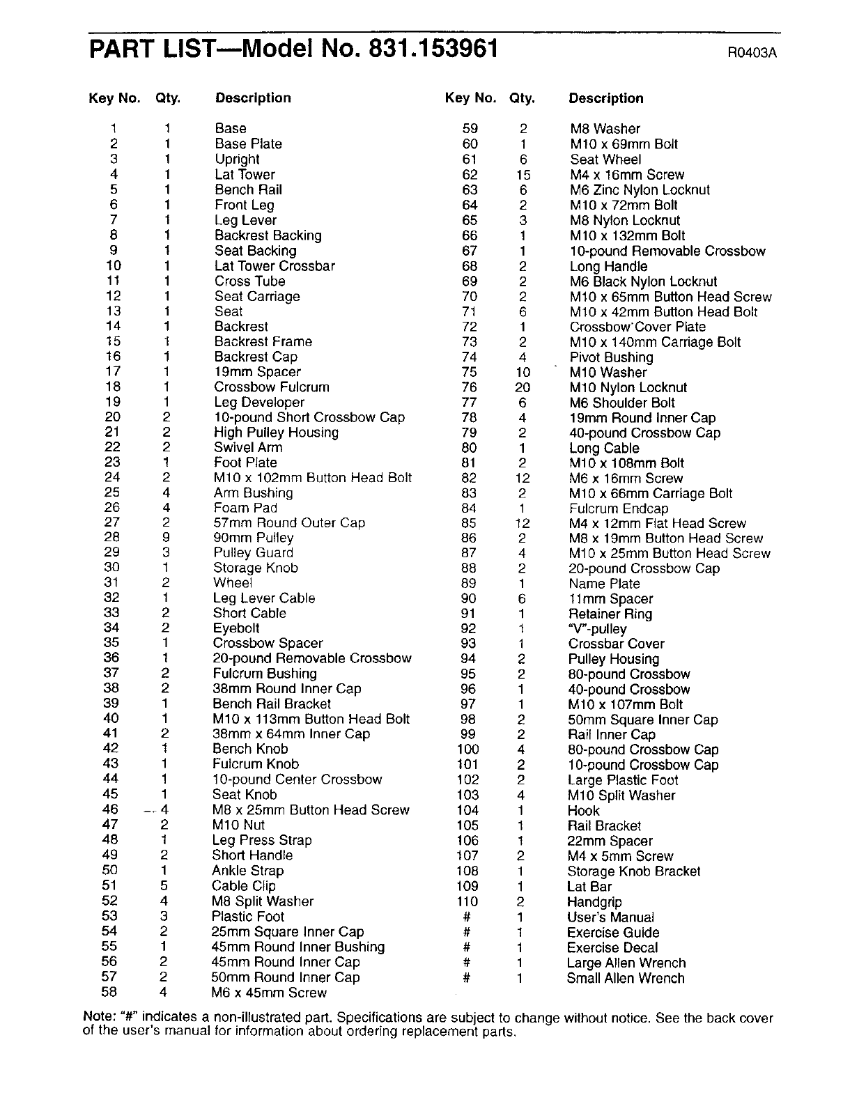 PART LISTmModel NO. 831.153961 R0403A