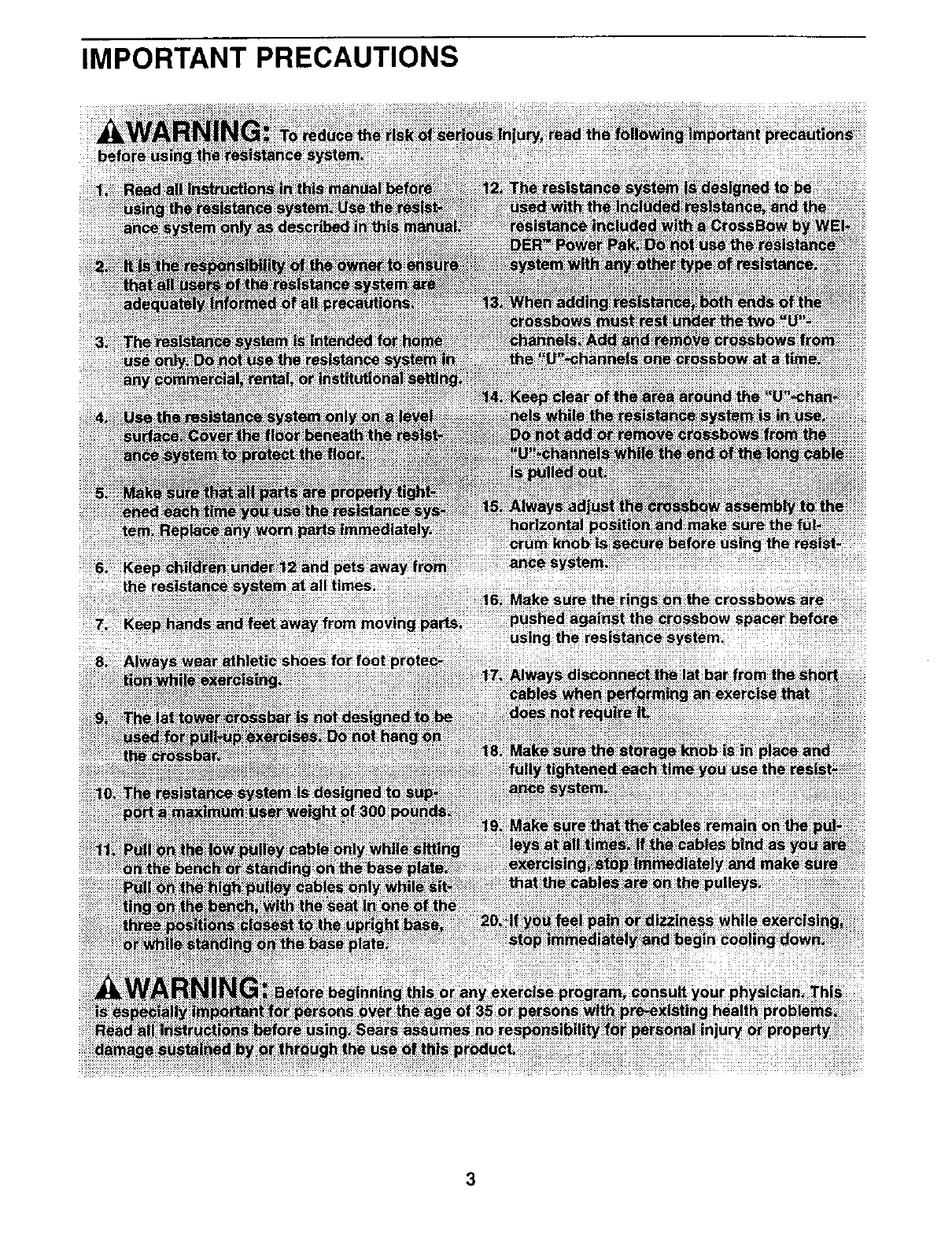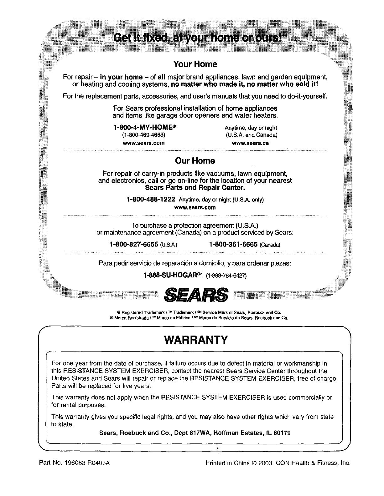 this RESISTANCE SYSTEM EXERCISER, contact the nearest Sears Service Center throughout the