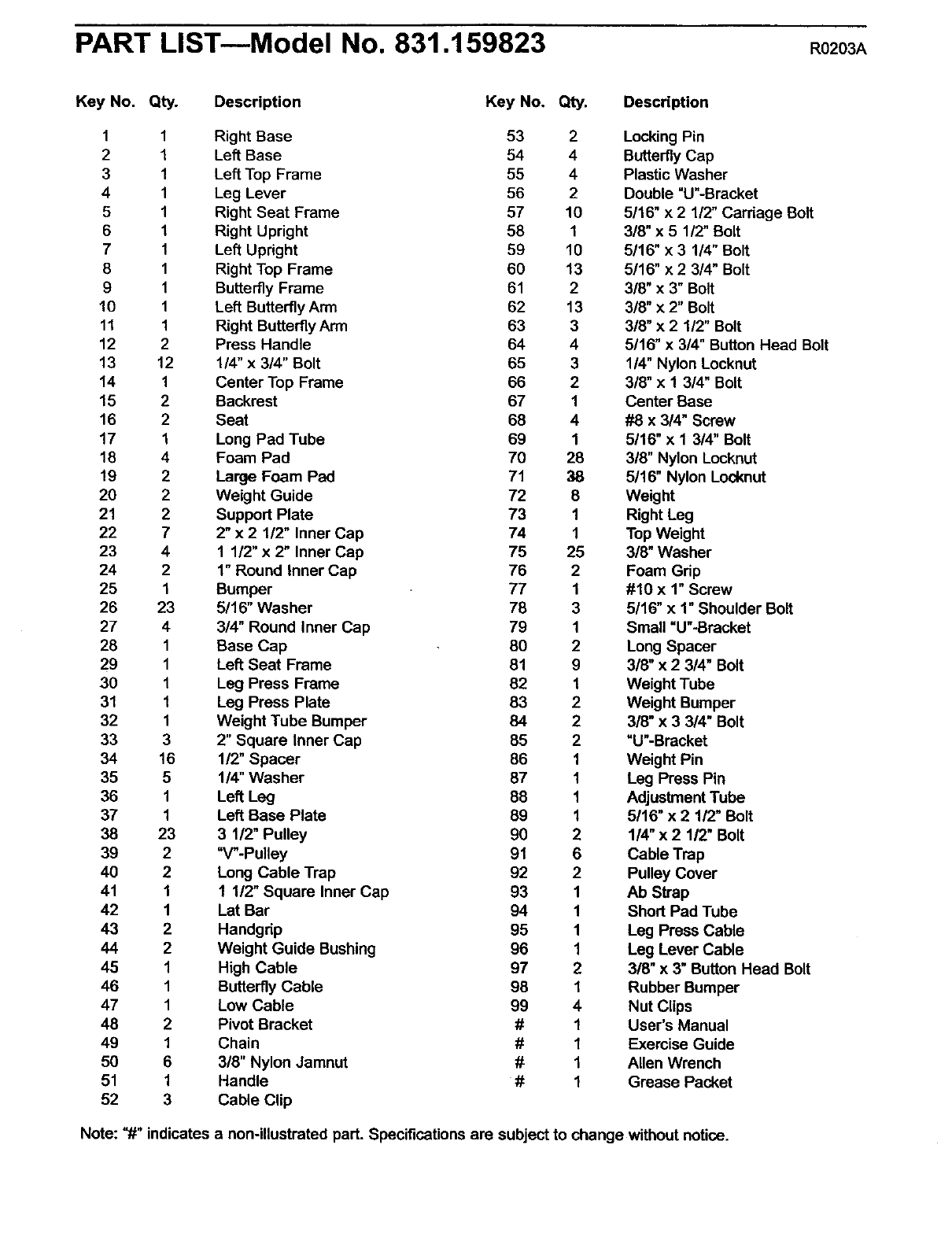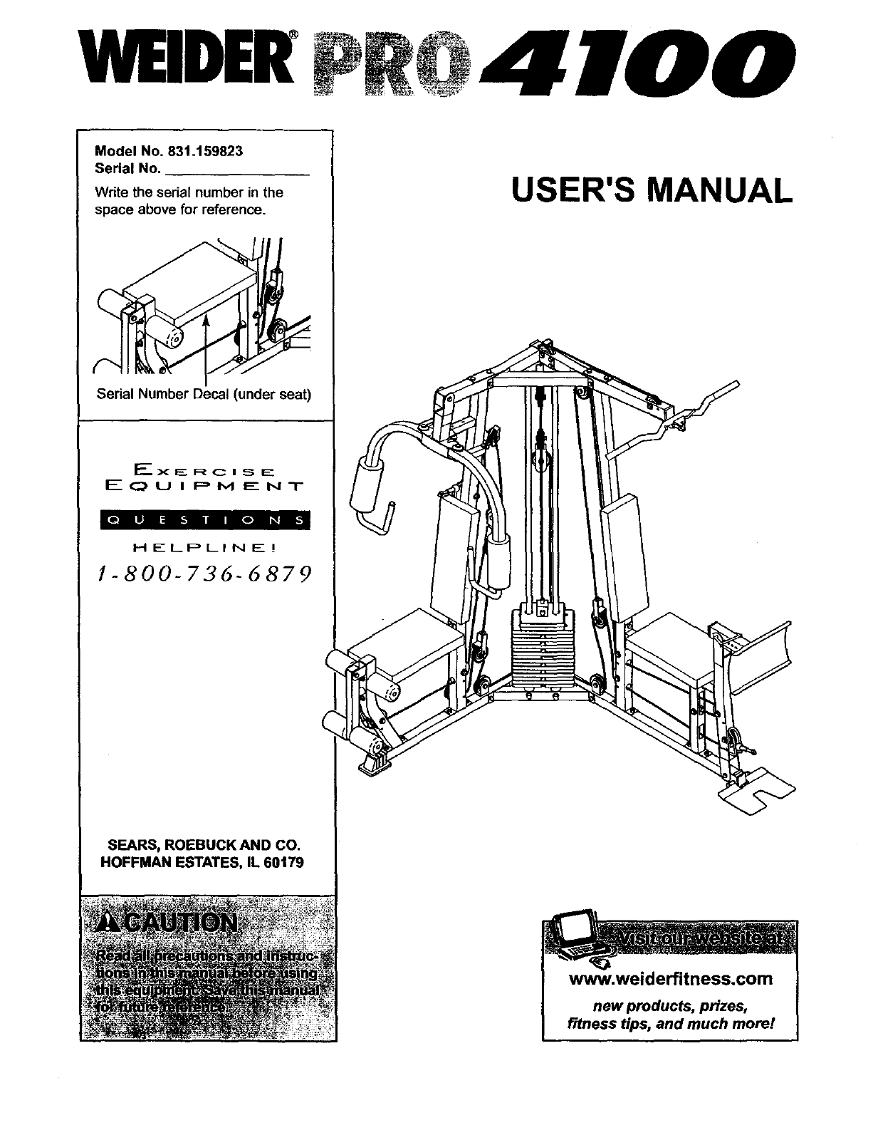 User Manual: Weider 831159823 831159823 WEIDER WEIDER PRO 4100 - Manuals and Guides View the owners manual for your WEIDER WEIDER PRO 4100 #831159823. Home:Fitness Equipment Parts:Weider Parts:Weider WEIDER PRO 4100 Manual