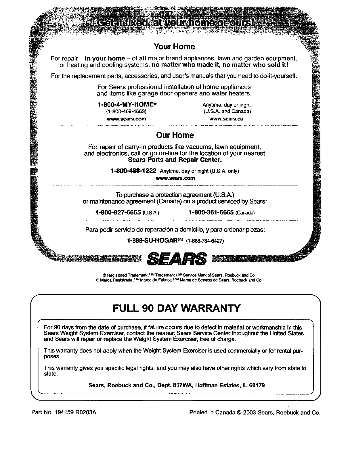 Sears Wetght System Exerciser, contact the nearest Sears Ser_ce Center throughout the United States