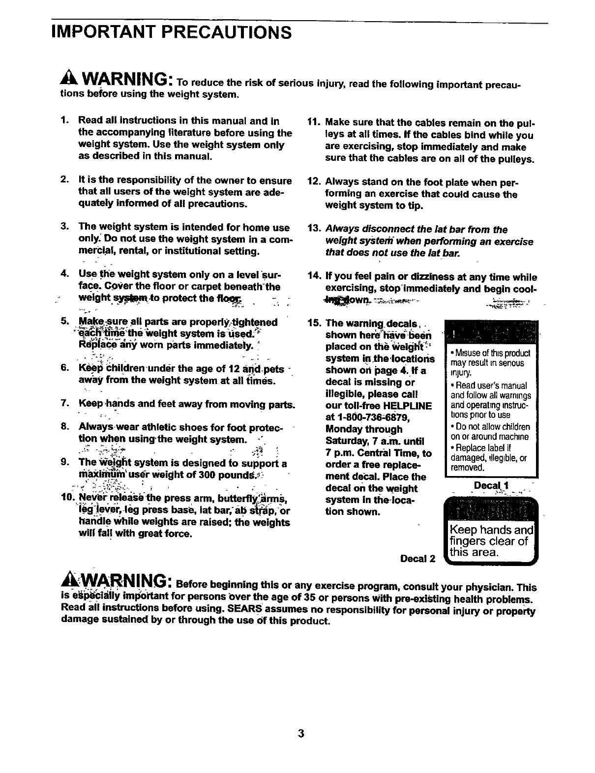 3. The weight system is intended for home use 13. Always disconnect the lat bar from the