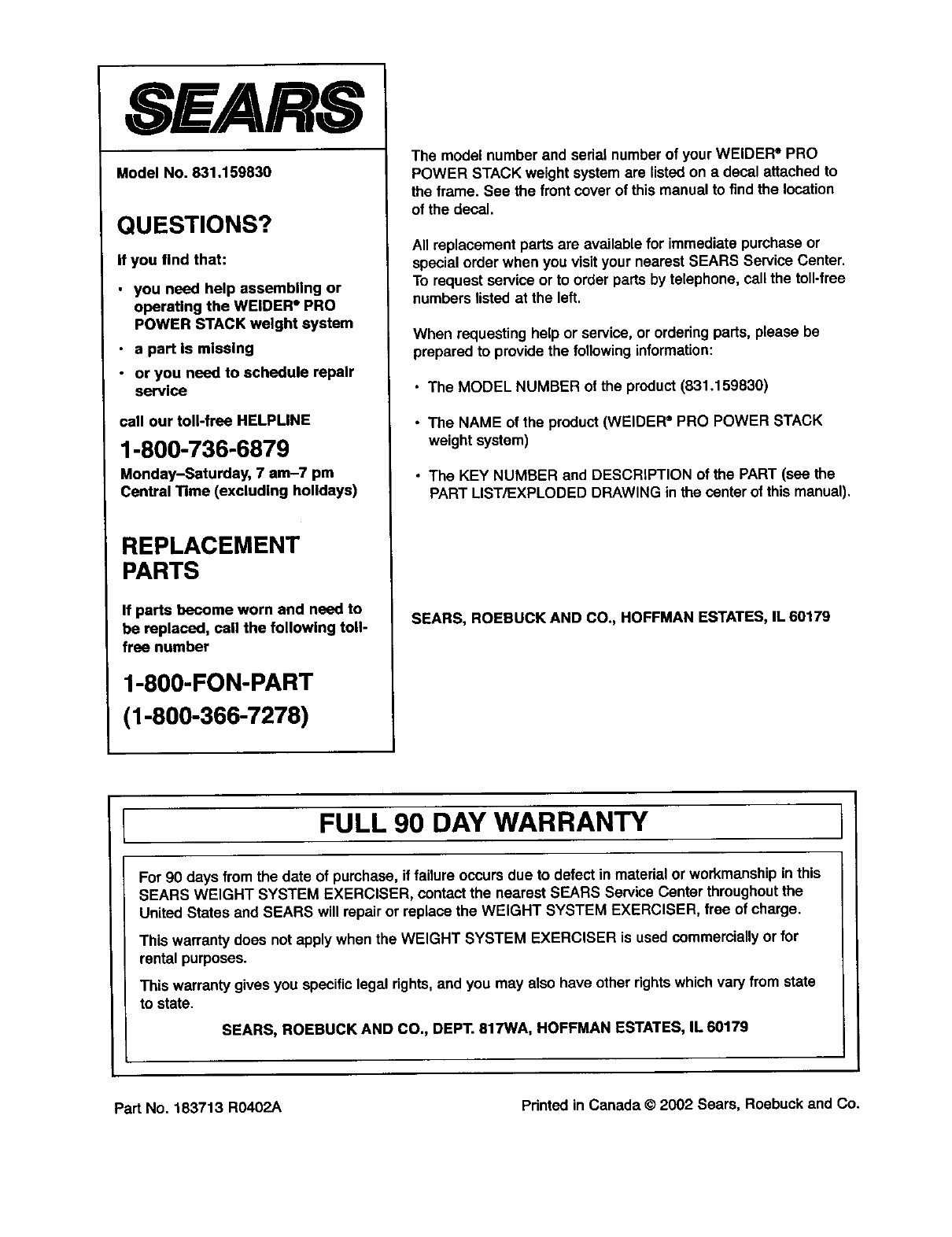 Part No. 183713 R0402A Pdnted in Canada ©2002 Seam, Roebuck and Co.