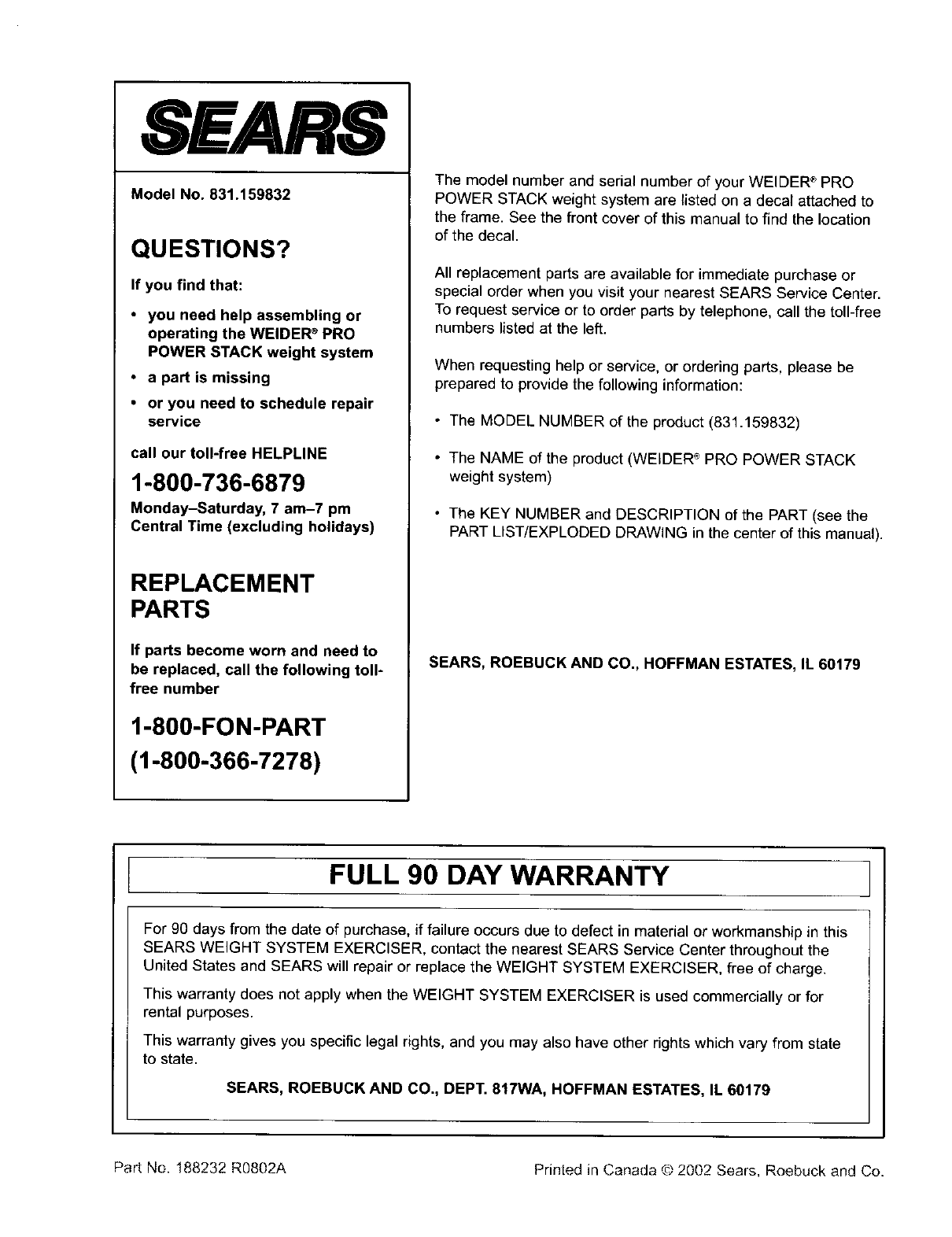Part No. 188232 R0802A Prinled in Canada ¢')2002 Sears, Roebuck and Co.