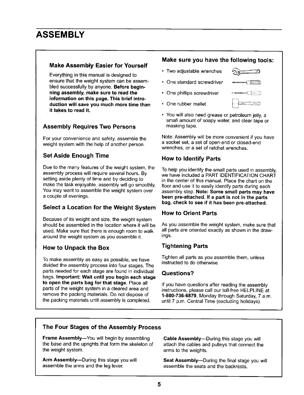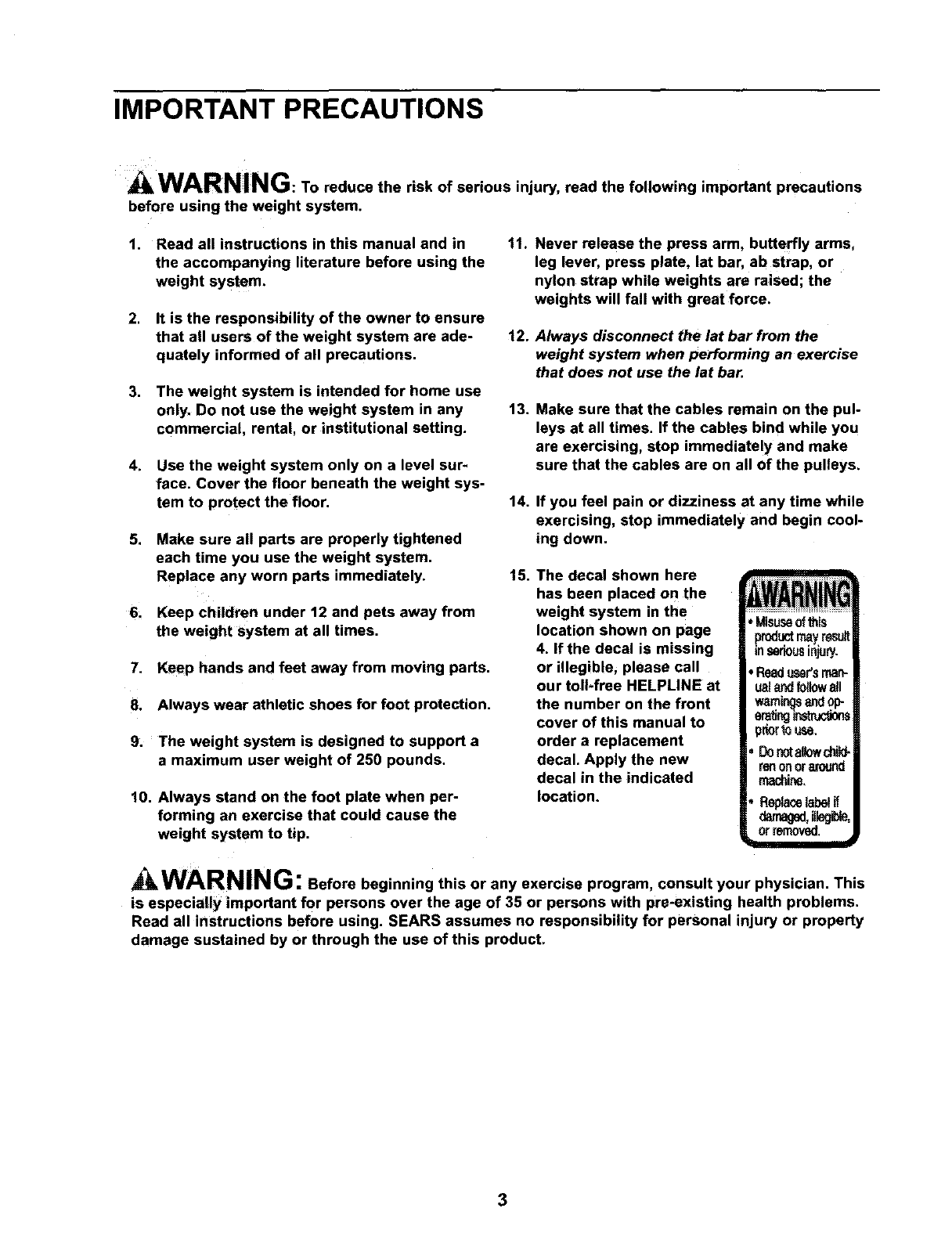 SEARS WEIGHT SYSTEM EXERCISER, contact the nearest SEARS Service Center throughout the