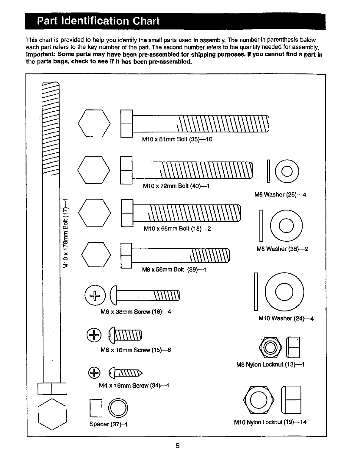 This chart is provided to help you identify the small parts used in assembly. The number in parenthesis below