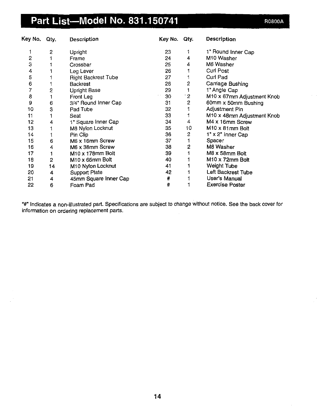 "#" Indicates a non-ilTustrated part. Specifications are subject to change without notice. See the back cover for