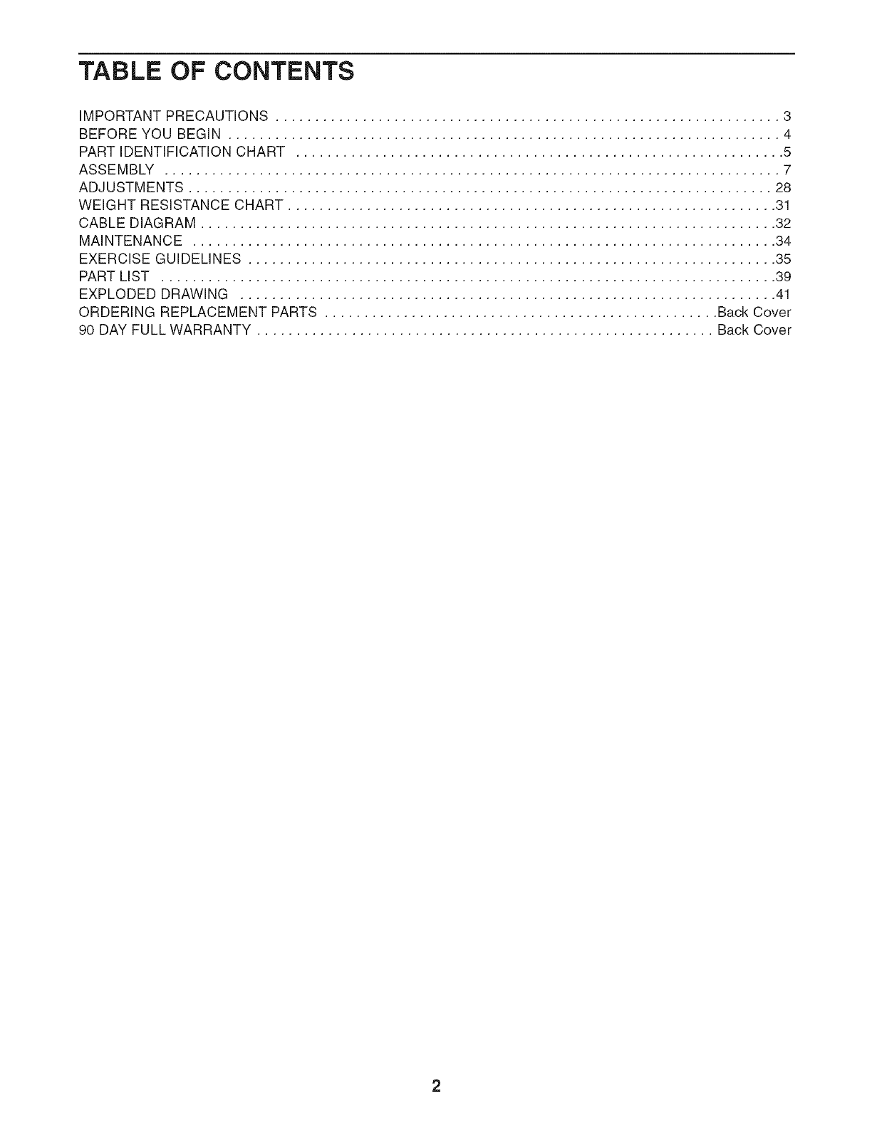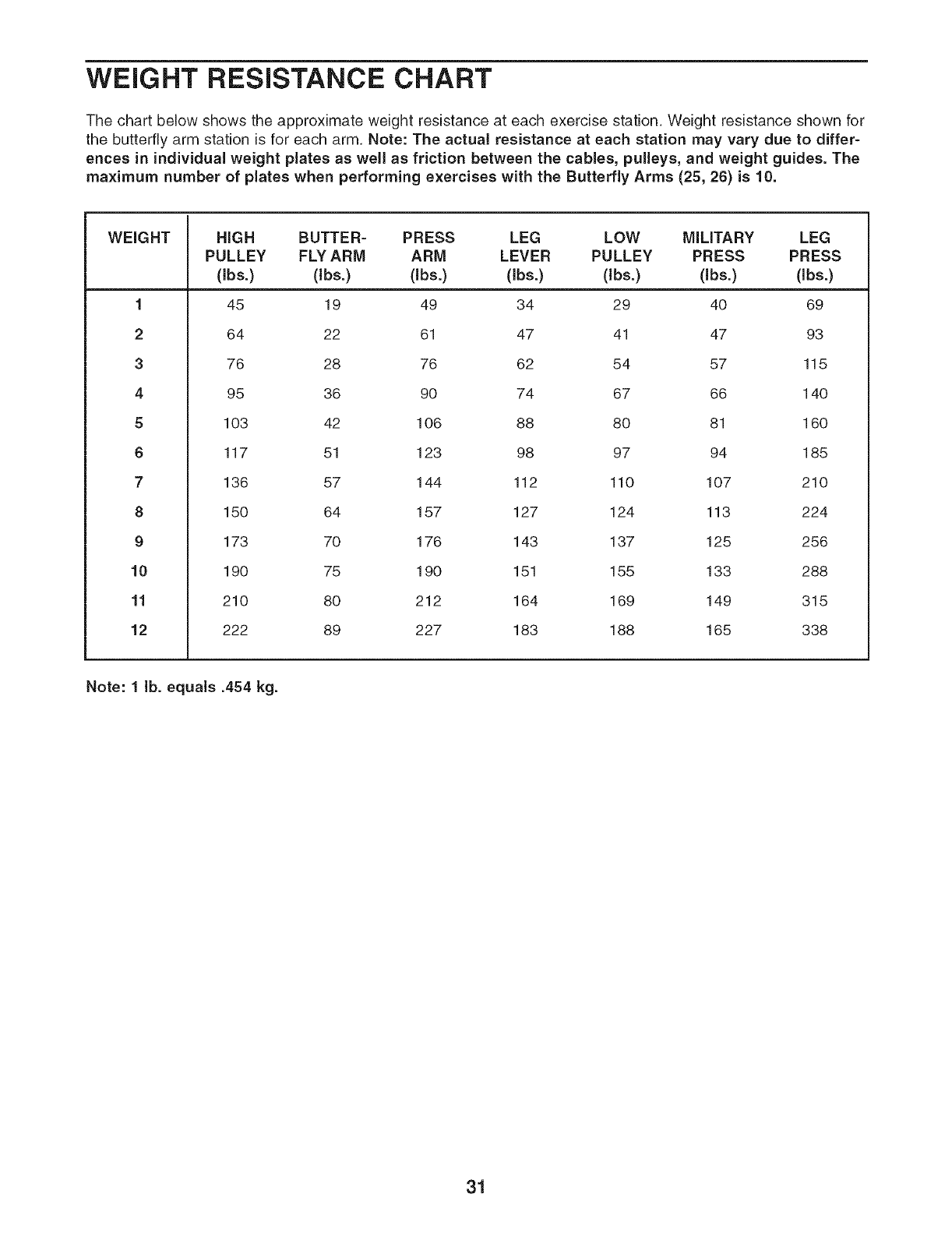 WEIGHT RESISTANCE CHART .............................................................. 31