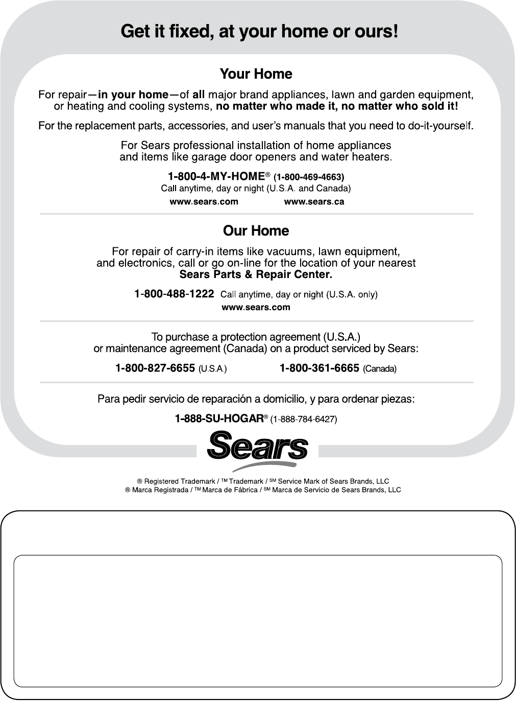 the date of purchase, call 1-800-4-MY-HOME® (1-800-469-4663) to arrange for free repair (or replace-