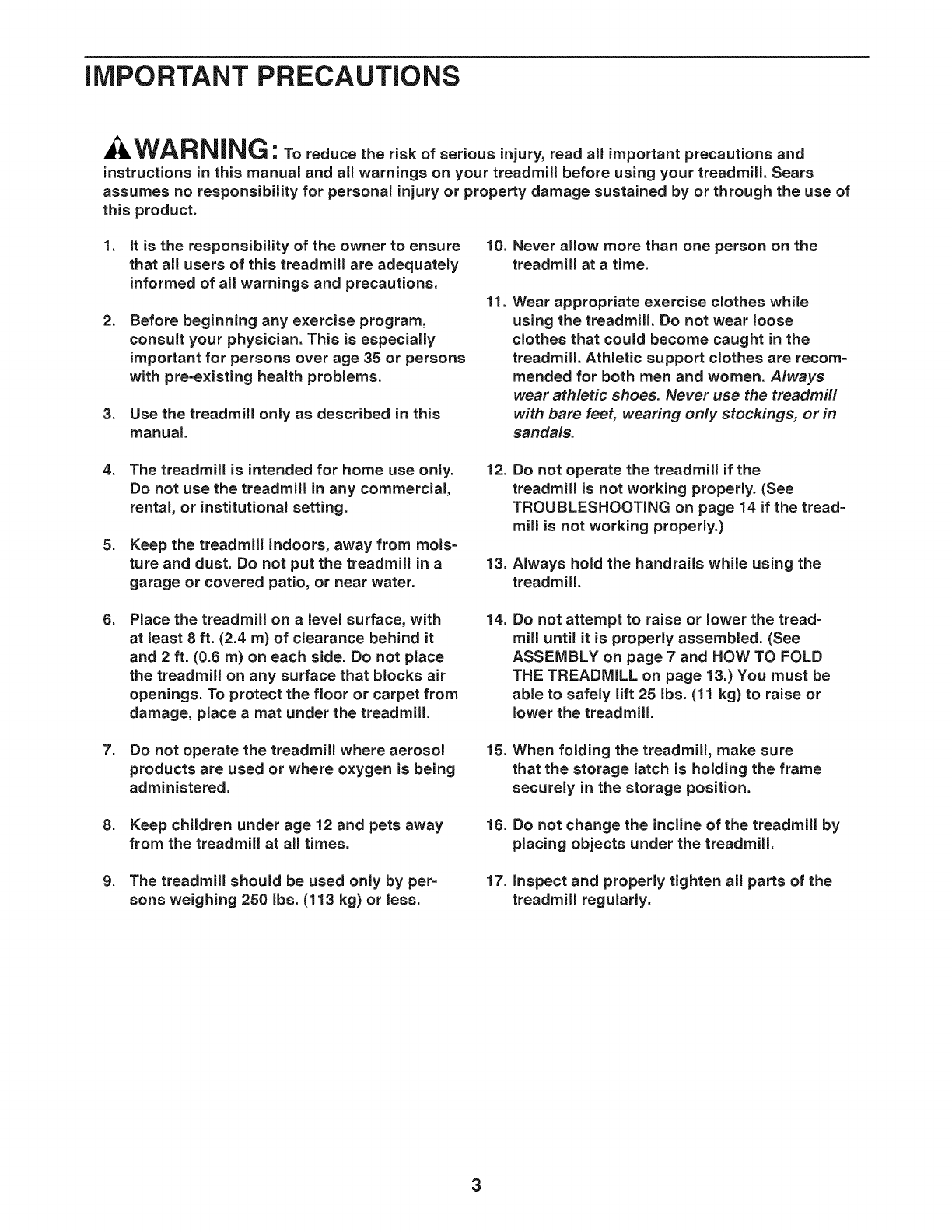 instructions in this manual and all warnings on your treadmill before using your treadmill. Sears