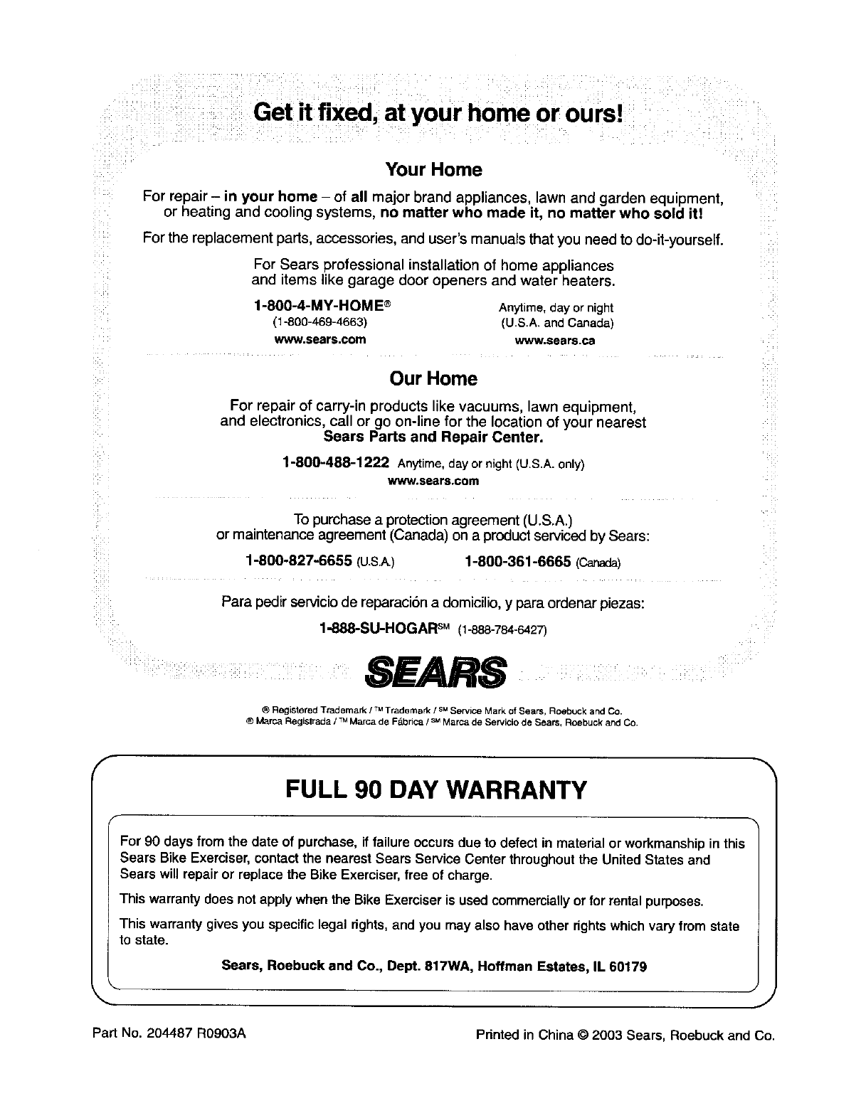 Part No. 204487 R0903A Printed in China ©2003 Sears, Roebuck and Co.