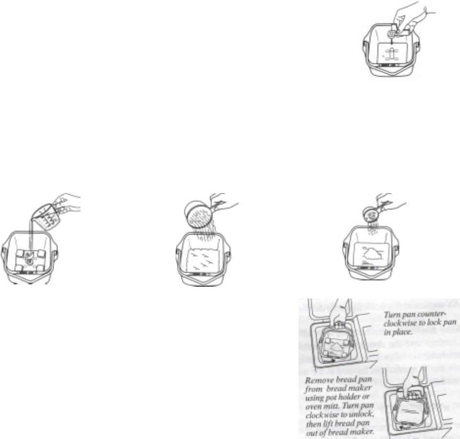 • Add ingredients to pan in this order: 1) all liquid ingredients first, 2) all dry ingredients, EXCEPT YEAST, putting salt