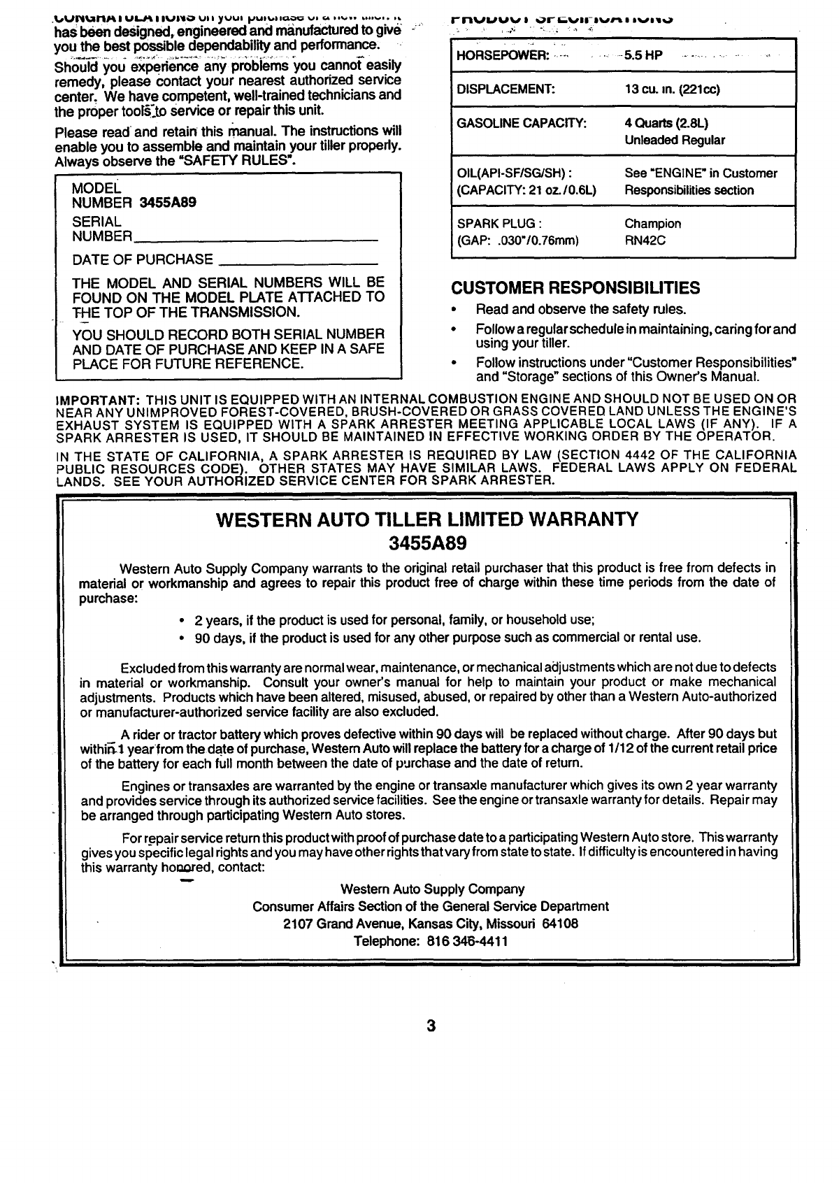 User Manual: Western Auto 3455A89 3455A89 WESTERN AUTO REAR TINE TILLER - Manuals and Guides View the owners manual for your WESTERN AUTO REAR TINE TILLER #3455A89. Home:Lawn & Garden Parts:Western Auto Parts:Western Auto REAR TINE TILLER Manual