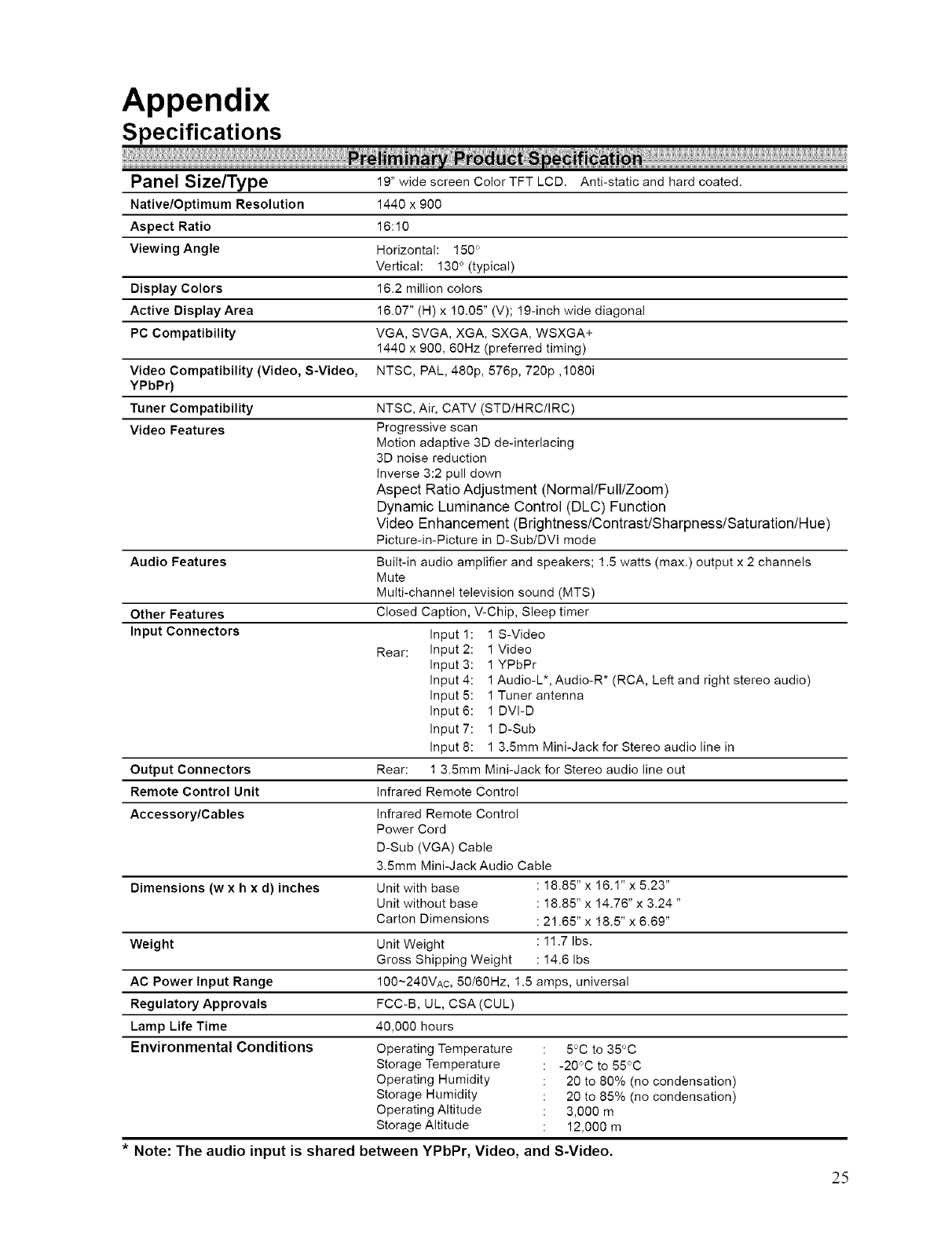 Panel Size/Type 19" wide screen Color TFT LCD, Anti-static and hard coated,