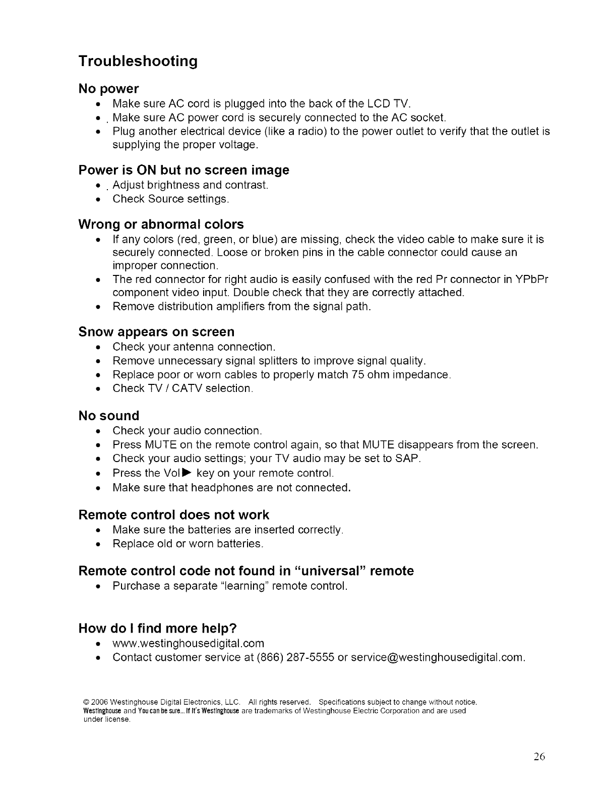 © 2006 Westinghouse Digital Electronics, LLC. Aft rights reserved. Specifications subject to change without notice.