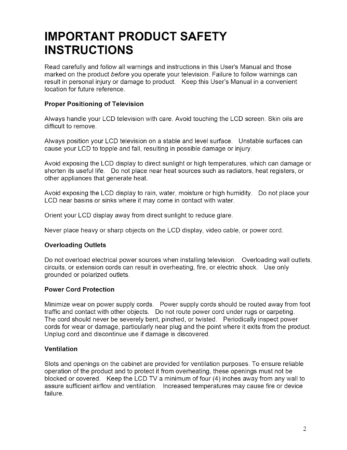 IMPORTANT PRODUCT SAFETY INSTRUCTIONS ...................................................................................... 2