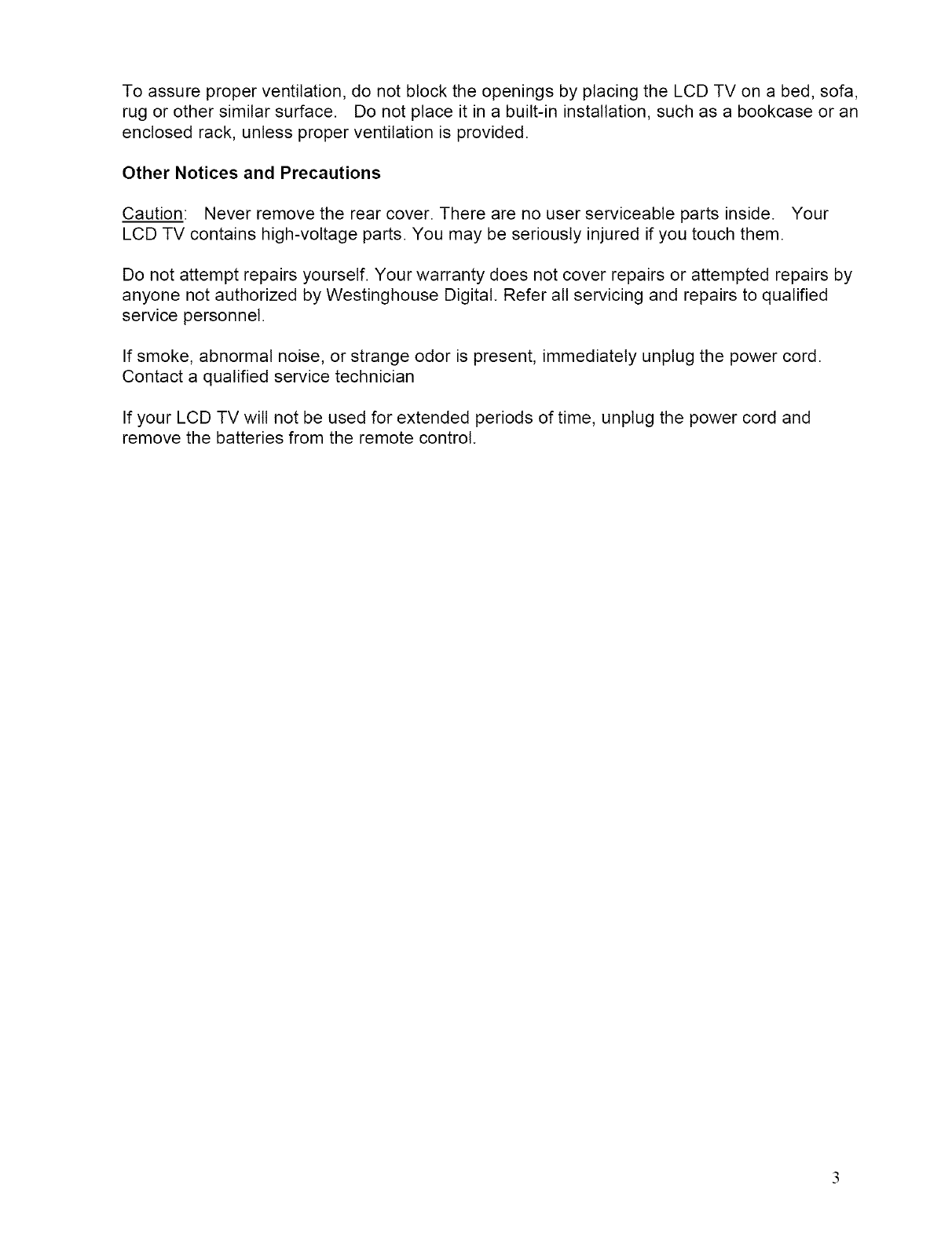 anyone not authorized by Westinghouse Digital. Refer all servicing and repairs to qualified