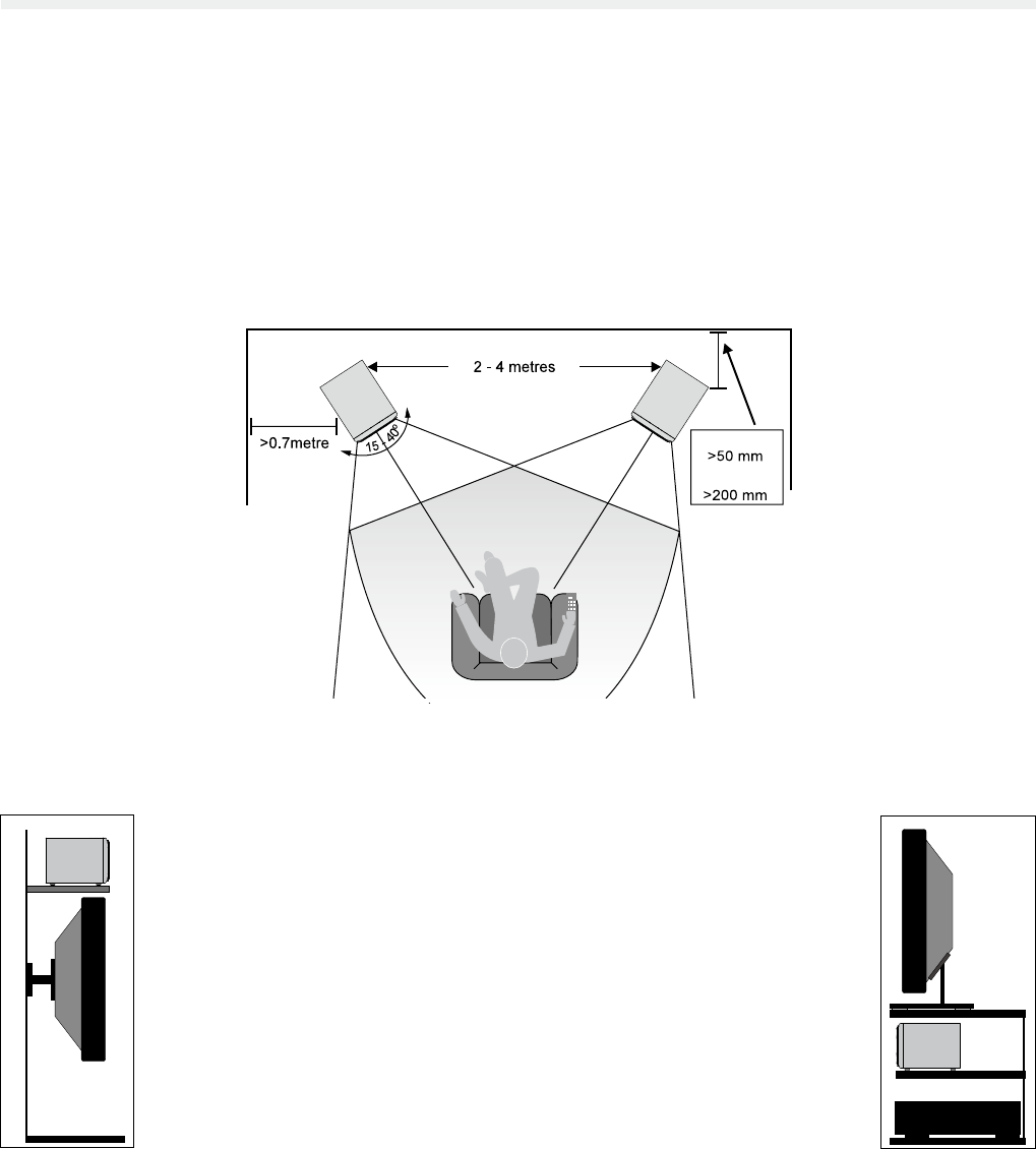 700mm from the side walls, facing slightly inwards. The 121 and 122 models should be stand or wall mounted though they may be placed on a